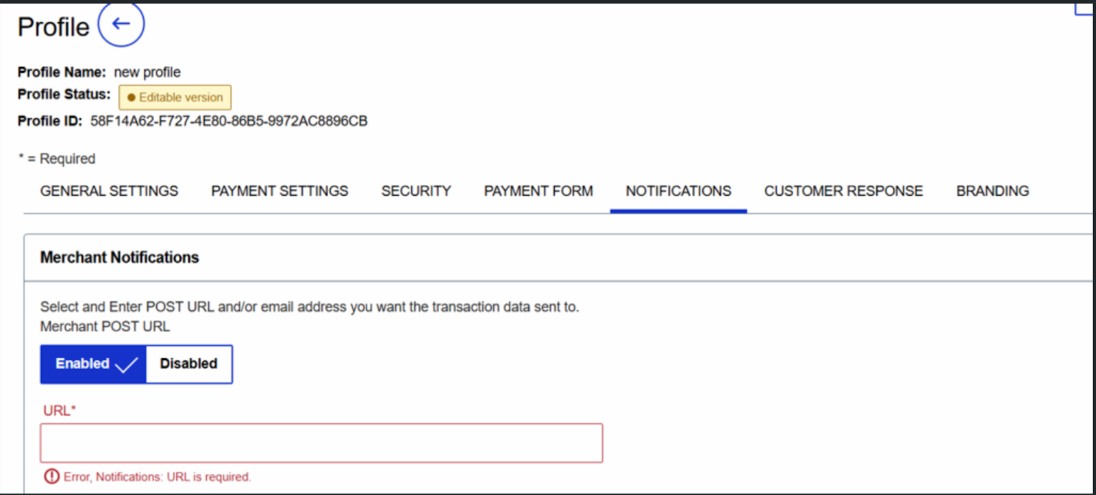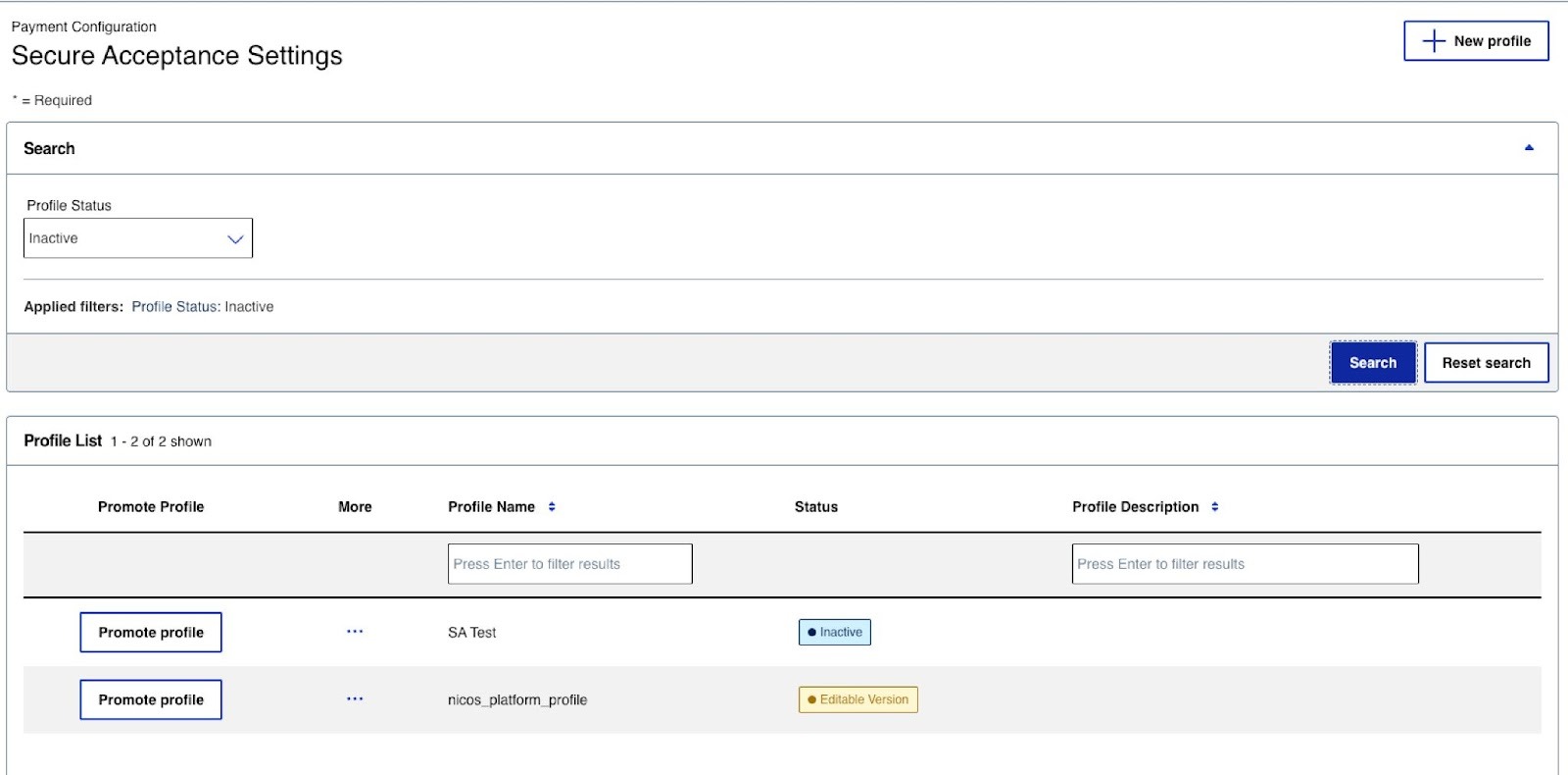 Before you can use the profile for test or live transactions, it needs to have the Status = Active. You can check this on the profile list or directly from the profile page.