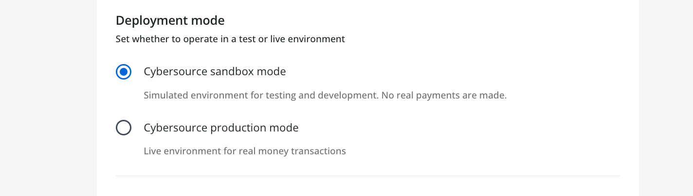 Tip: Remember that, if the credentials entered are for a sandbox Secure Acceptance profile, then you must also select the Sandbox deployment mode. If you instead entered credentials for a production profile, then select the Production deployment mode.
