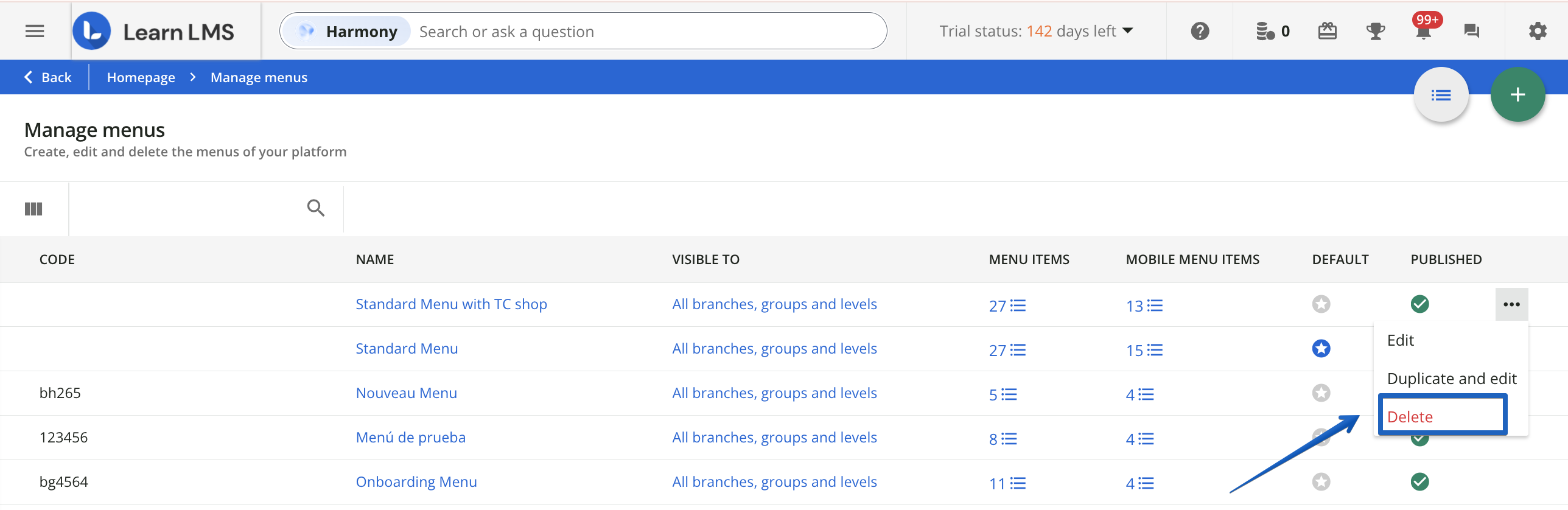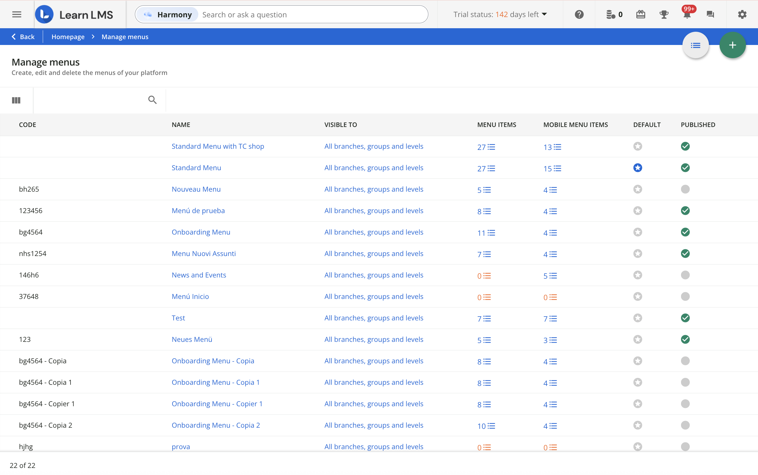 For each menu, the list displays the name and code, to whom it is visible, the number of pages composing the desktop and the mobile menu, whether it is the platform default menu, and whether the menu is published or not. The default menu is for both desktop and mobile; you cannot have different default menus.