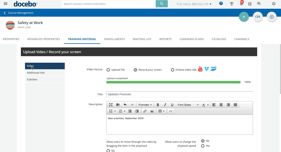 Now, in the Video tab on the upload page, decide if you want users to be able to move through the video by dragging the playhead. Please note that if you enable this option, users can jump and skip part of the videos, which will mark the material as complete despite the fact that parts of the video were not viewed.