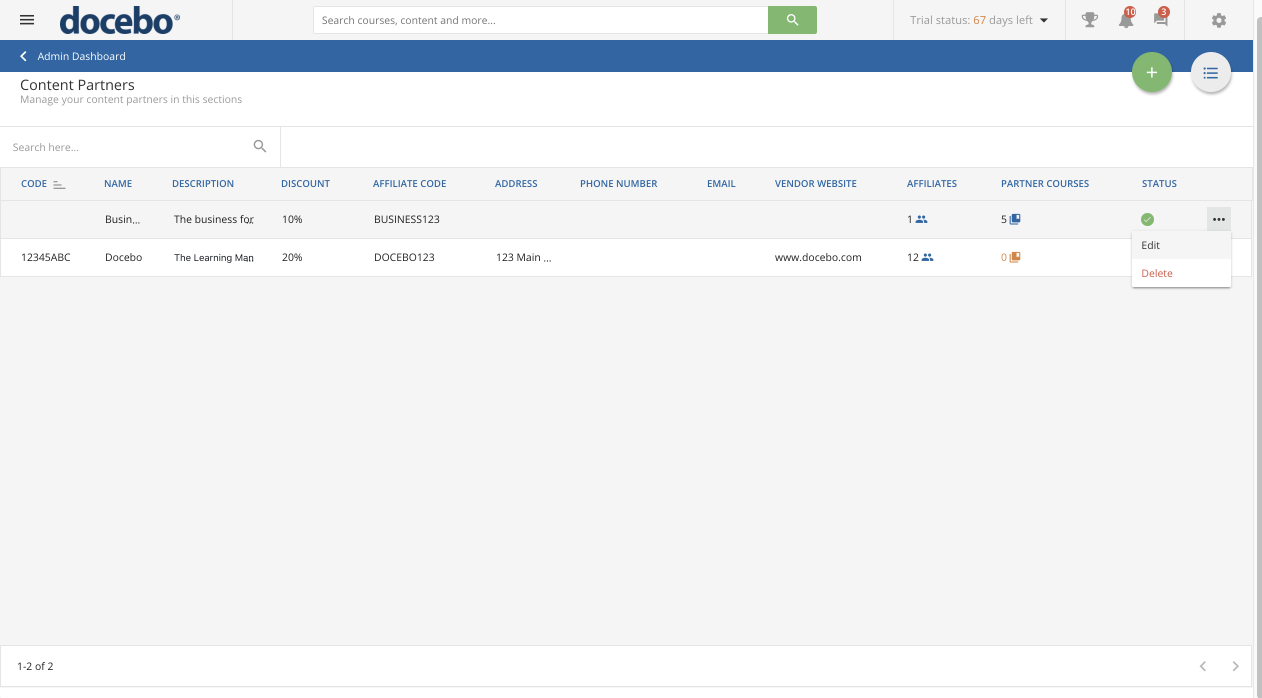 The Content partners page allows you to add a list of content providers within the platform and assign courses to them. Courses assigned to these partners are generally courses in which the course content comes from the partners.