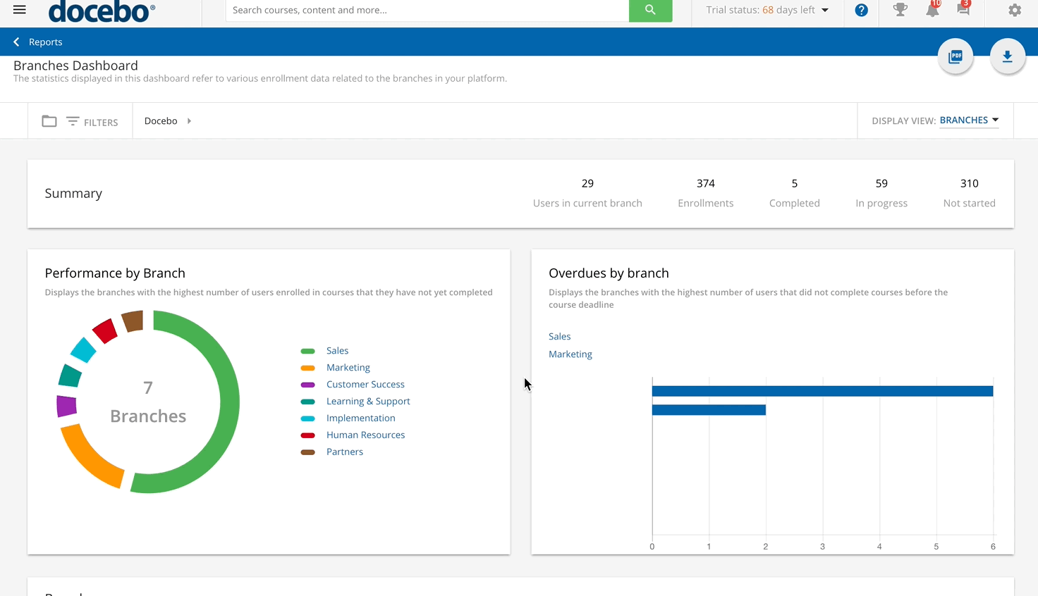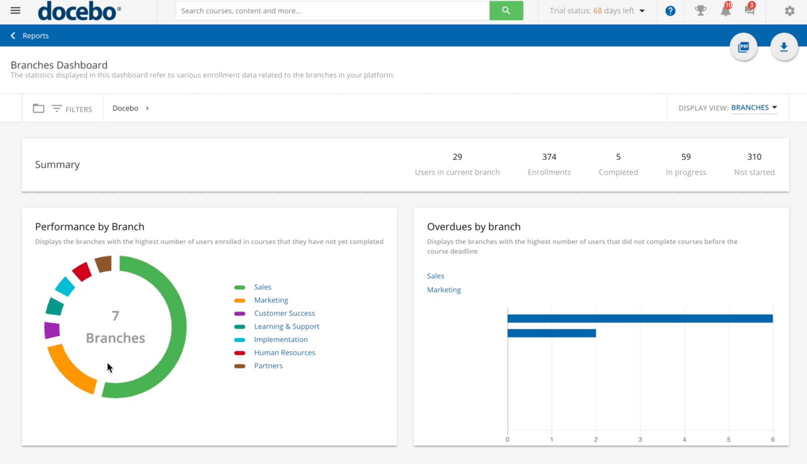 *The total enrollment number also includes users that are enrolled into courses that may be on the Waiting list of a course or have any status in the course (i.e. Suspended) that somehow links the user to the course. In the Performance by branch section, the donut chart displays the first several branches with the highest number of users enrolled in courses that they have not yet completed (they have any status other than Completed in a course). For each branch, the size of their portion in the chart depends on the total number of users in the branch with the In progress or Not started statuses.