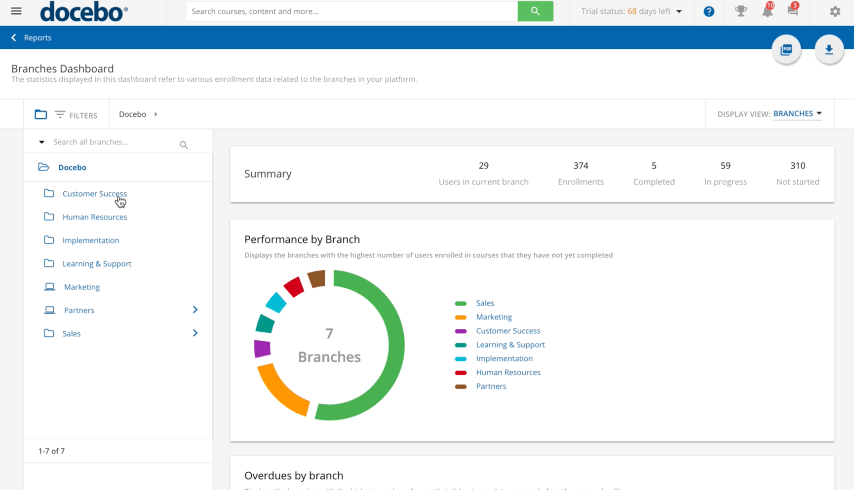 In the Overdues by branch section, you can view a bar chart related to the top eight branches with the highest number of overdue enrollments (users enrolled into courses, but they did not complete the courses by the deadline). By clicking on the branch in the chart, the dashboard will then display graphs and statistics related specifically to that branch (see the section below).