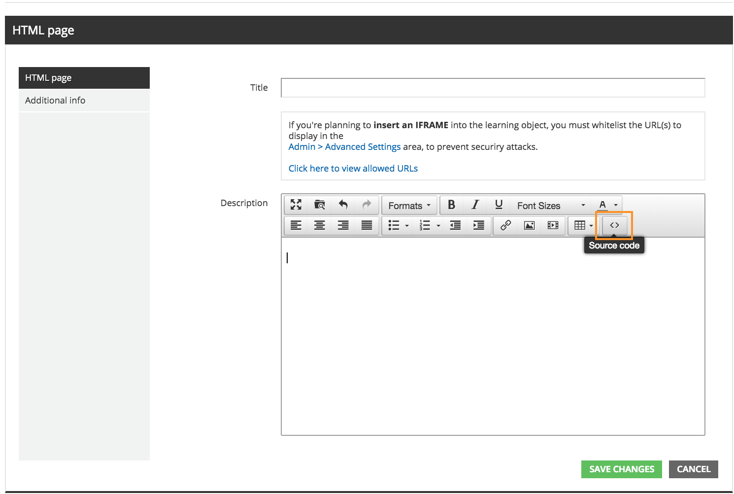 Once you've added the URL to your allow list, you can insert the iframe into your HTML training material. In the description box on the upload page for the training material, choose the Source code icon. Then, insert the URL between the following tags