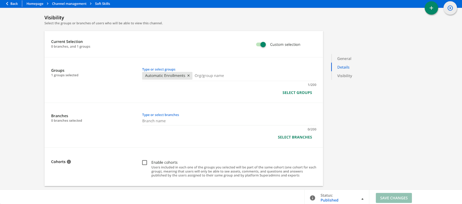 Please note that you cannot associate a channel to a single user. If you want to choose specific groups or branches of users who will be able to view the channel, activate the Custom selection toggle, then type or select groups and/or branches in the corresponding fields. Moreover, by enabling the Cohorts option, you can customize the visibility of your groups and the content you share with them.