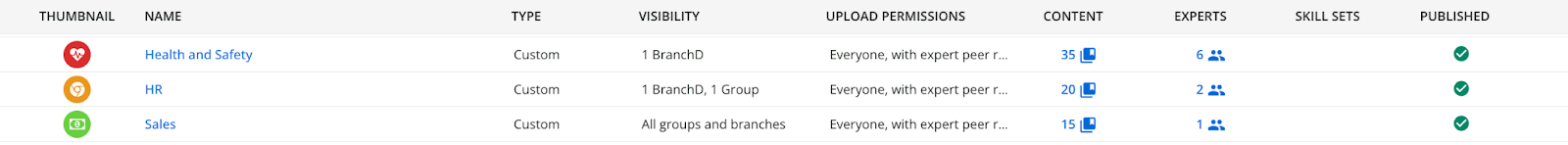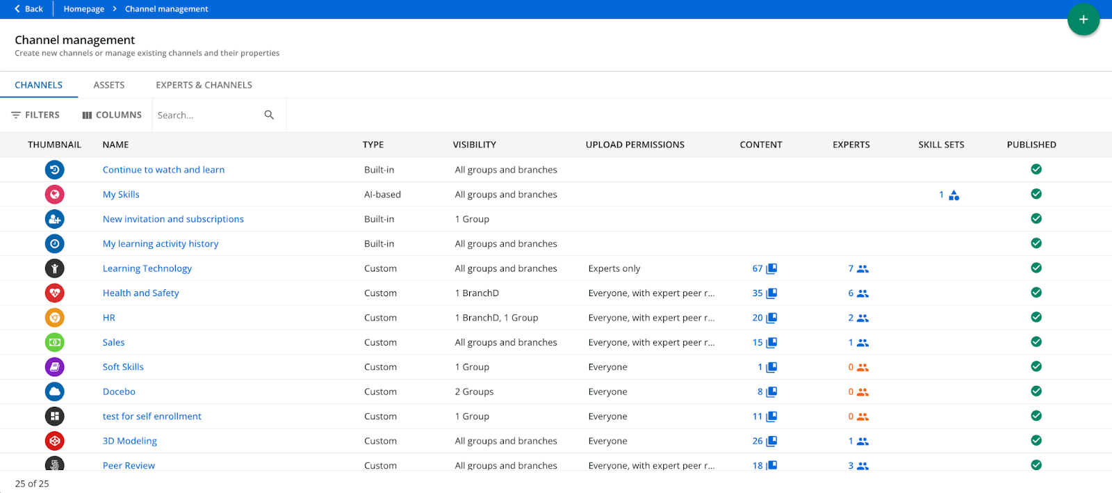 Every channel’s row shows the following columns: thumbnail, channel name and description, channel type, visibility, upload permissions, content, experts, and skill sets assigned to the channel, and the channel’s publication status.