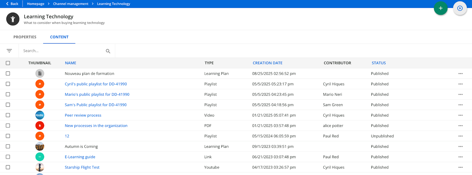 For each item the list shows the thumbnail, name, type of content, its creation date, the contributor who uploaded the content (for assets), and finally its status (published or unpublished). By clicking on the content’s name, you will access its page to view its details and edit it