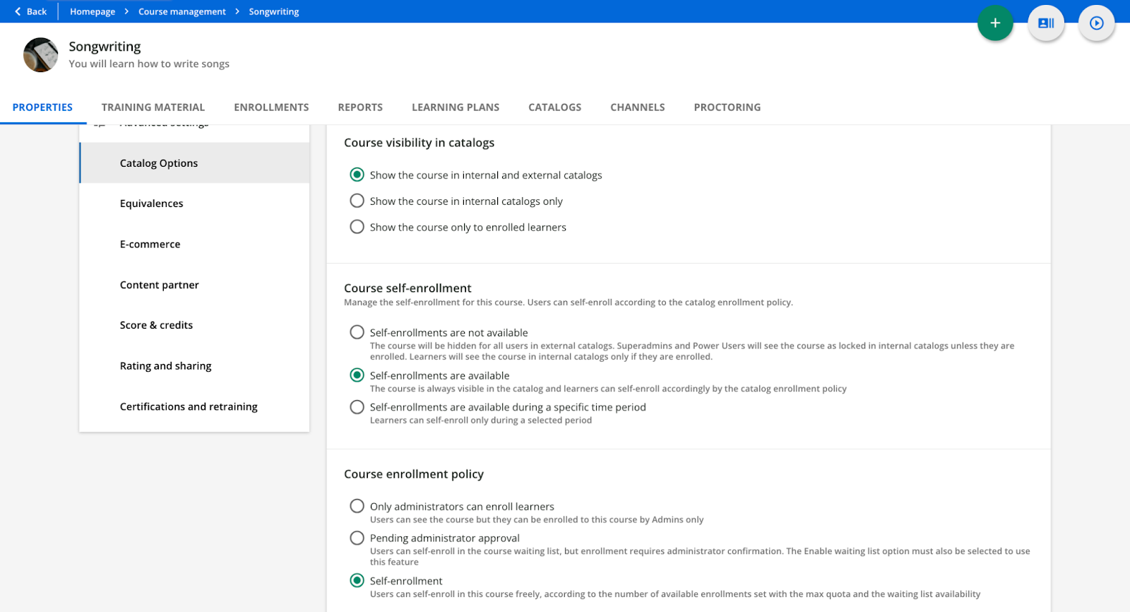 Catalog options to make a course visible in channels