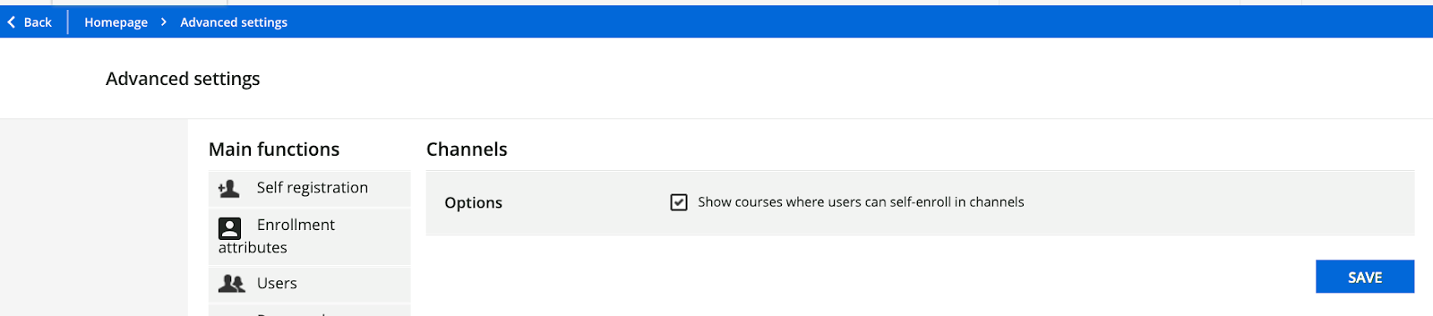 If you want users to be able to self-enroll in courses from channels, you need to enable the setting Show courses where users can self-enroll in channels in the Channels tab of the platform Advanced settings menu.