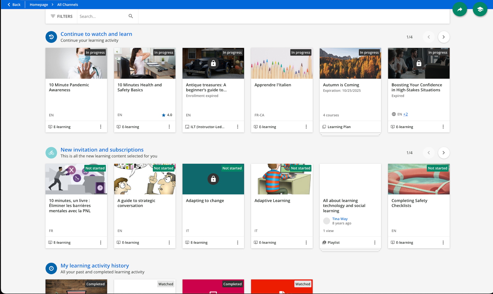 - My learning activity history. This channel includes all of the courses or learning plans that a learner has already completed, and all the assets they have already watched.