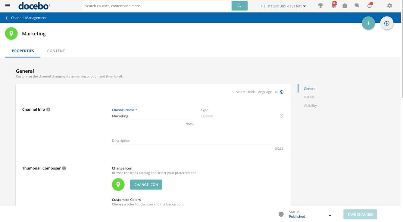 Channels can be made visible to all learners, or you can restrict their visibility only to certain groups and/or branches. To configure a channel’s visibility, from the list of channels, click the [channel name] to open its configuration page. Then, in the Properties tab, scroll down to the Visibility section.