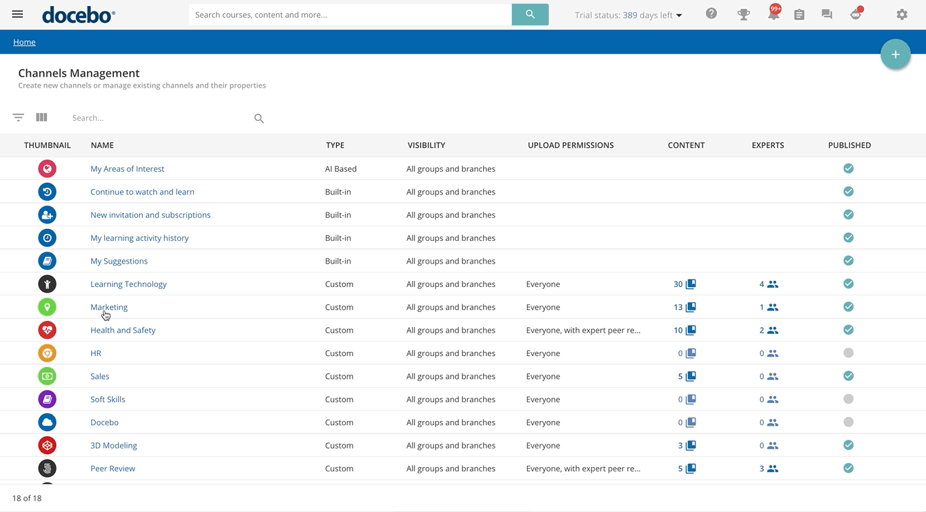 Channels are curated collections of content that help organize how learners browse and access the material available to them on the platform. Channels can include a mixture of formal content (courses and learning plans) as well as informal assets (images, videos, PDFs, playlists etc).