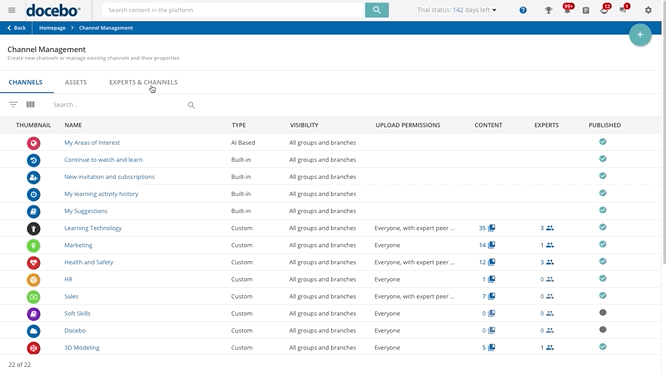 Disclaimer: AI-based channels and the Skills sets column are visible only on platforms with Skills. The Upload permissions and Experts columns are visible only on platforms with Discover Coach & Share.