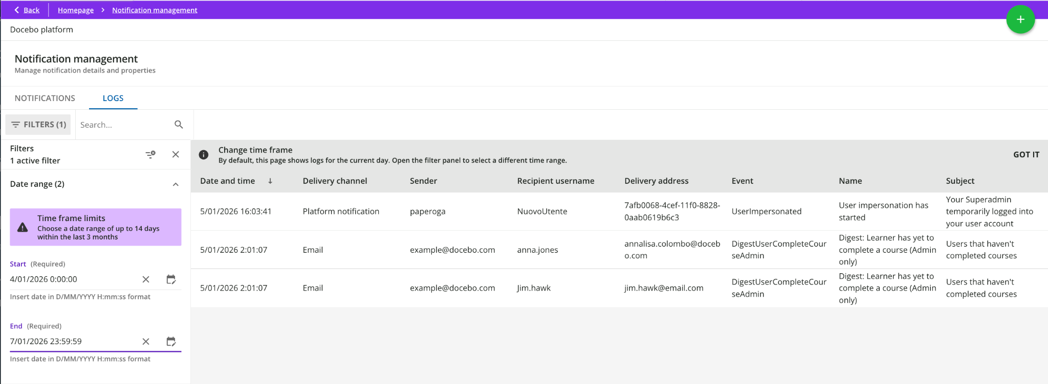 From the main notification management page, the Logs tab lets you check all the notifications that have been triggered. By default when you open this tab it shows you the current page. But you can set a filter to view a different date range:
