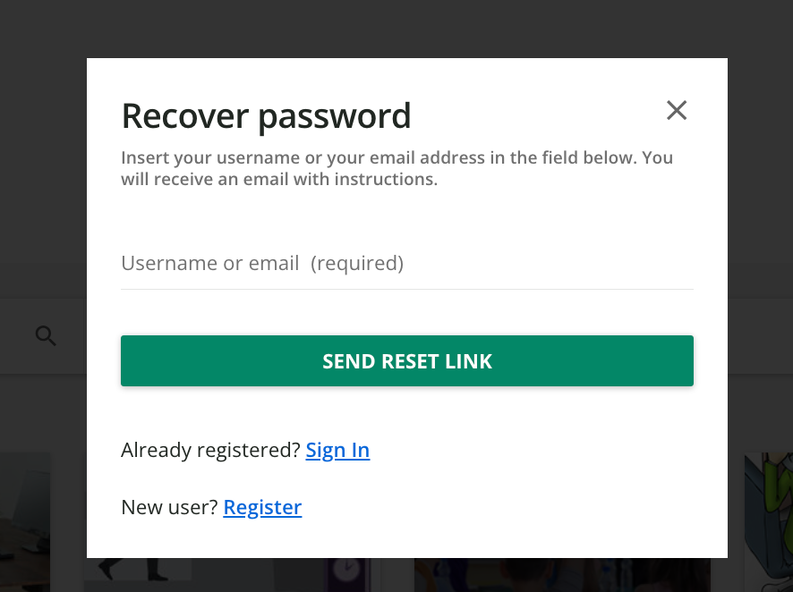 In the Recover password window that opens, enter either the username or email address that corresponds to your account on the platform, then click Send reset link.