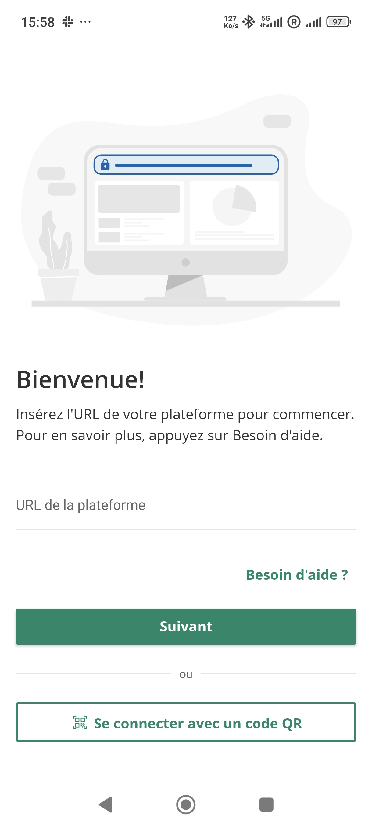 Astuce : si le bouton Se connecter avec un code QR, vous pouvez l’utiliser pour insérer automatiquement l’URL de votre plateforme et/ou vos identifiants de connexion. Consultez le chapitre Se connecter avec un code QR pour découvrir comment utiliser cette méthode.
