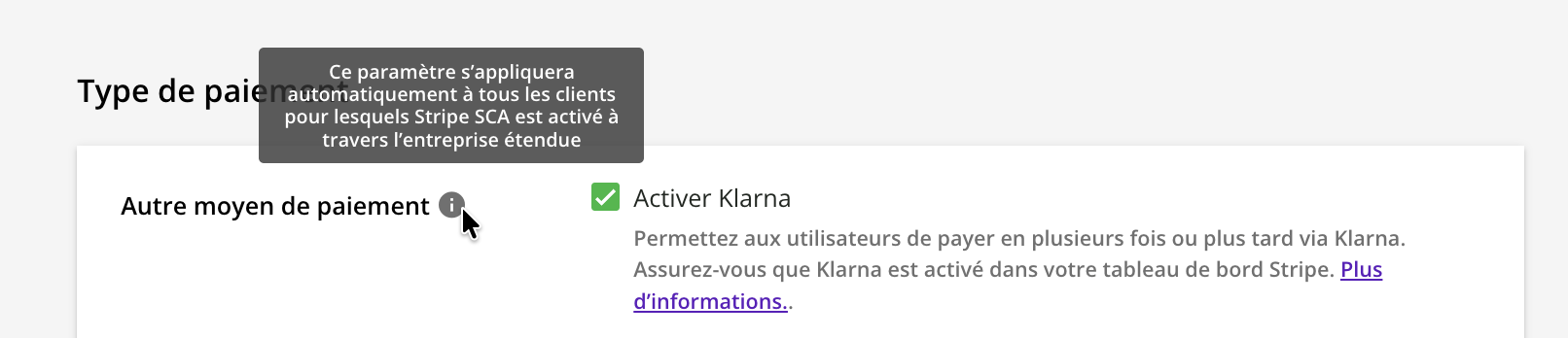 À noter : lorsque vous activez Klarna, l’intégration avec la plateforme impose les paramètres par défaut pour cette option, écrasant toute potentielle configuration personnalisée définie dans Stripe.