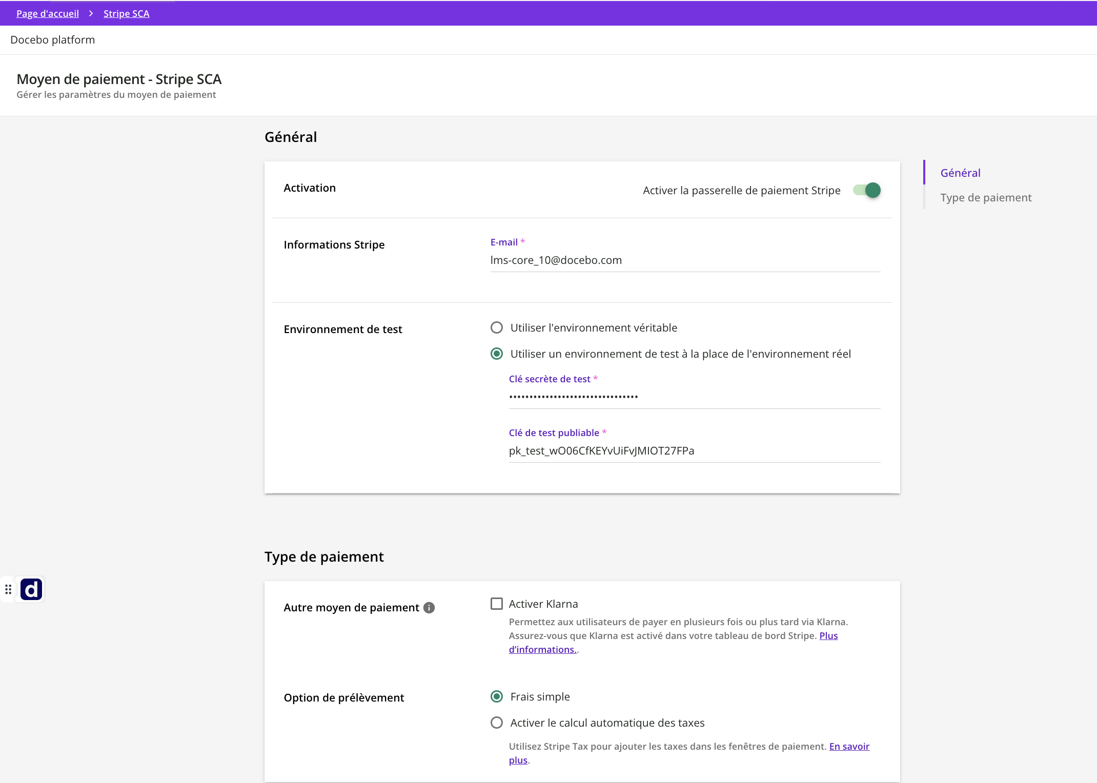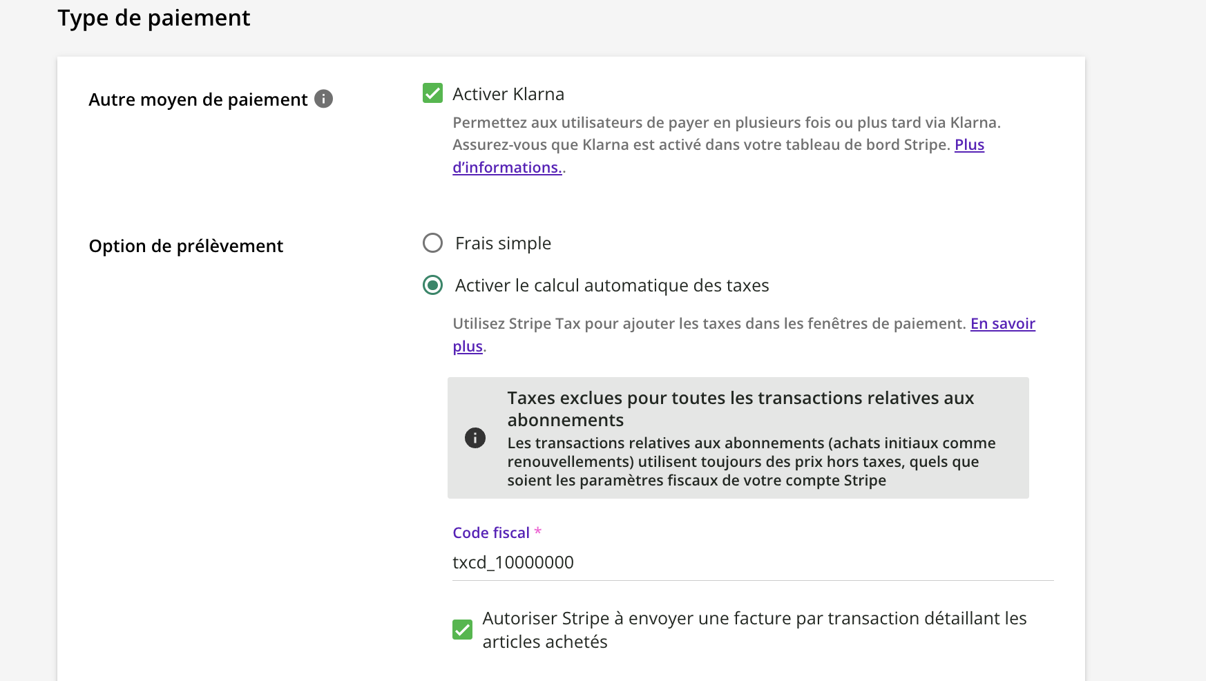 Sélectionnez Menu admin > Moyen de paiement - Stripe SCA > Gérer, puis sur la page de configuration de Stripe, descendez à la section Type de paiement et cochez l’option Activer le calcul automatique des taxes.