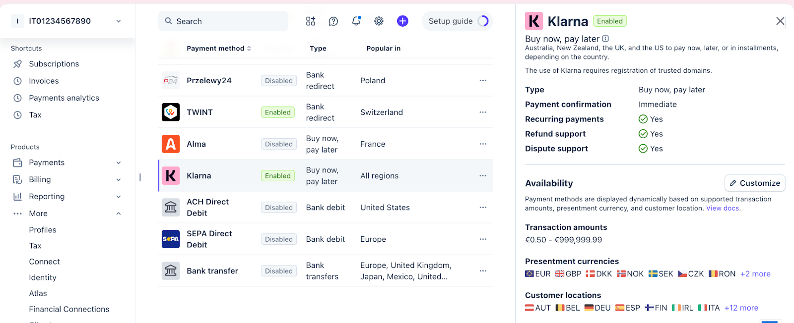 Vous devez également activer Klarna dans votre tableau de bord Stripe. Pour en savoir plus, consultez la documentation de Stripe relative aux paiements avec Klarna (s’ouvre dans un nouvel onglet).