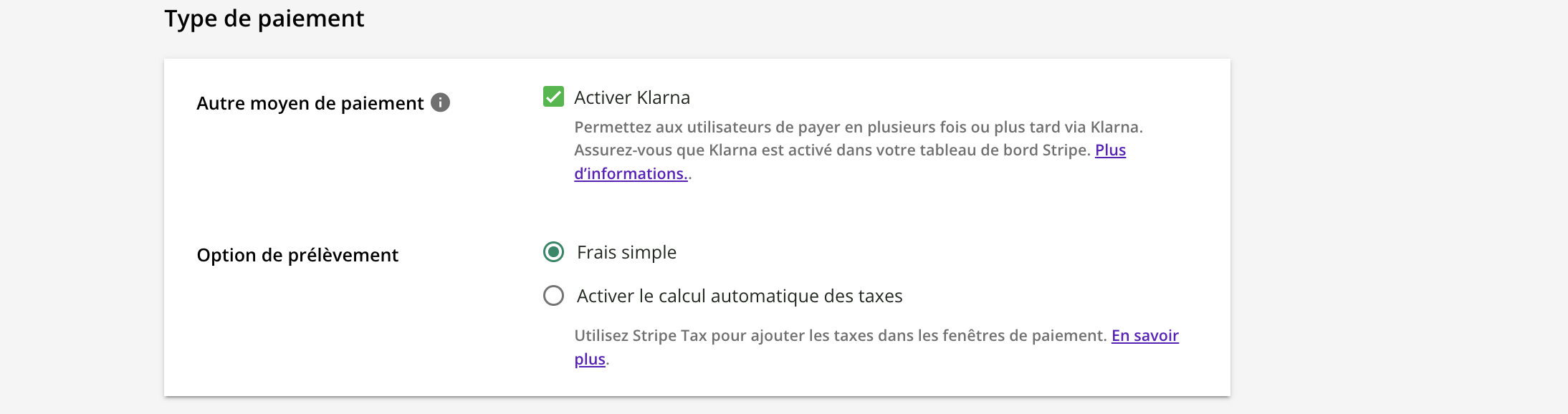 Dans la section Type de paiement, si vous n’avez pas besoin de Stripe Tax (calcul automatique des taxes), vous pouvez laisser l’option Option de prélèvement sur la valeur par défaut, Frais simple.