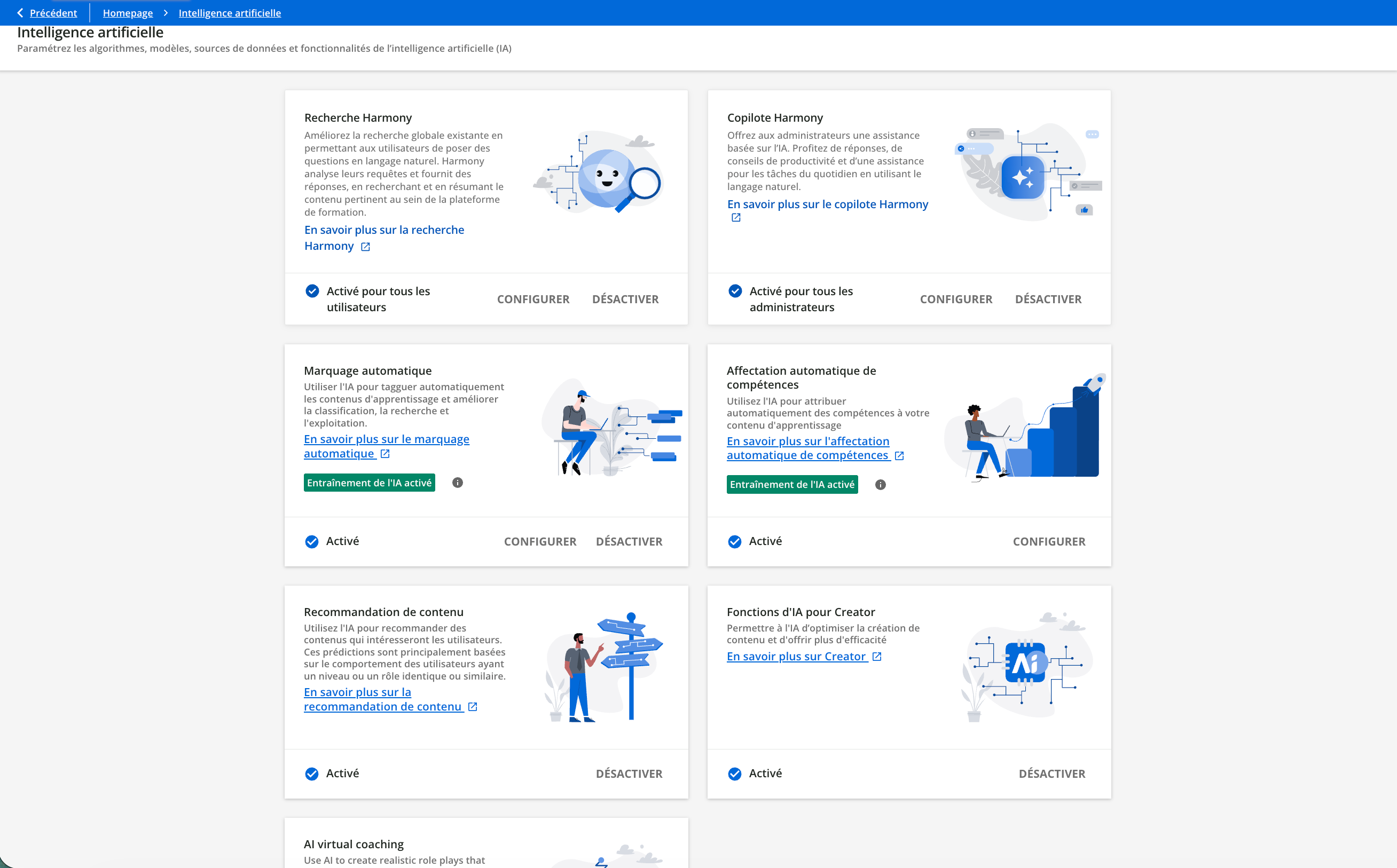 Tous les utilisateurs de la plateforme - apprenants, managers et administrateurs - peuvent bénéficier de l’IA et, comme pour toutes les autres fonctionnalités de la plateforme, nous souhaitons nous assurer que vous savez maîtriser au mieux ces outils innovants conçus pour vous permettre de gagner du temps. Cet article explique comment gérer les paramètres de l’intelligence artificielle depuis le panneau de configuration de l’IA. Plus d’informations sur l’IA sur votre plateforme.