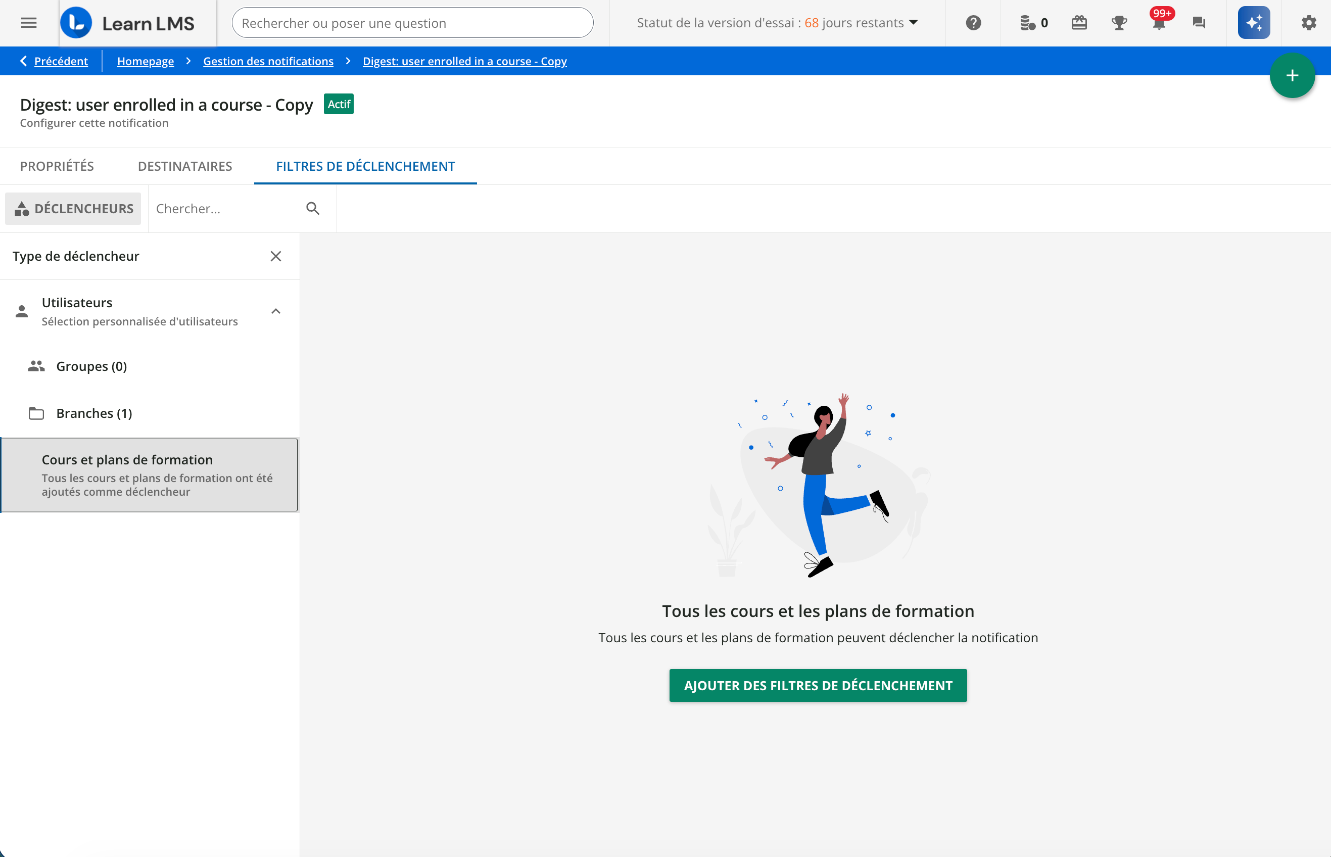 Si cela se produit, la cause peut être une notification migrée ciblant des cours supprimés ou inactifs. Ces notifications n’ont en effet aucun filtre de contenu appliqué (car tout le contenu ciblé a été supprimé ou désactivé).