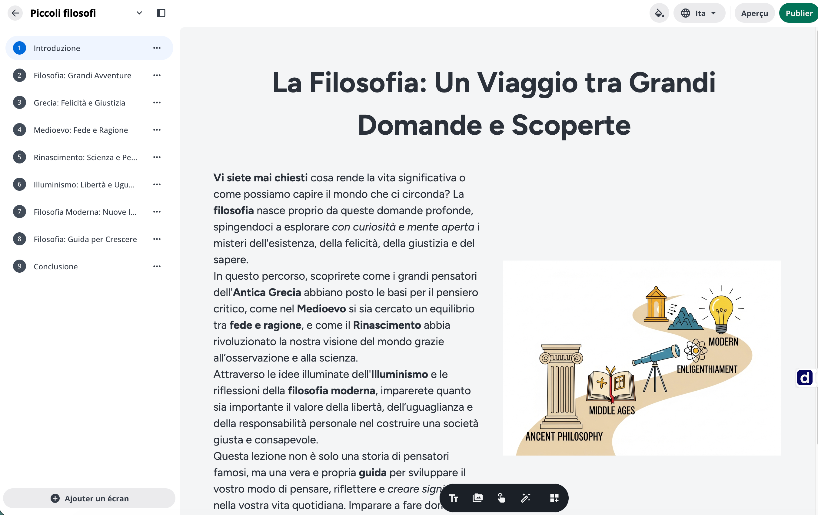 Si vous avez créé votre leçon avec l’IA, la leçon s’ouvrira avec une série d’écrans déjà créés en fonction de vos données. Vous pouvez modifier ces écrans ou en ajouter de nouveaux si nécessaire.