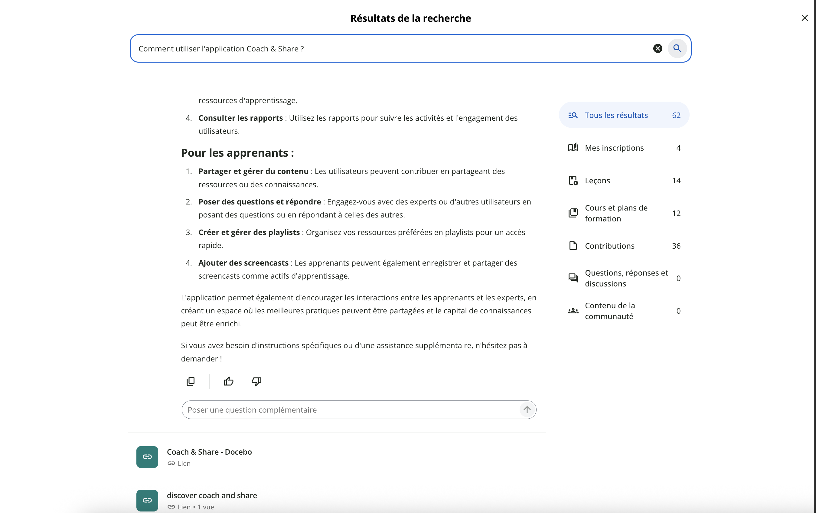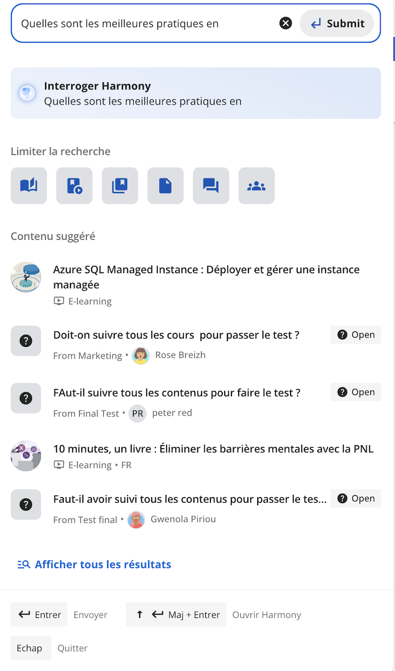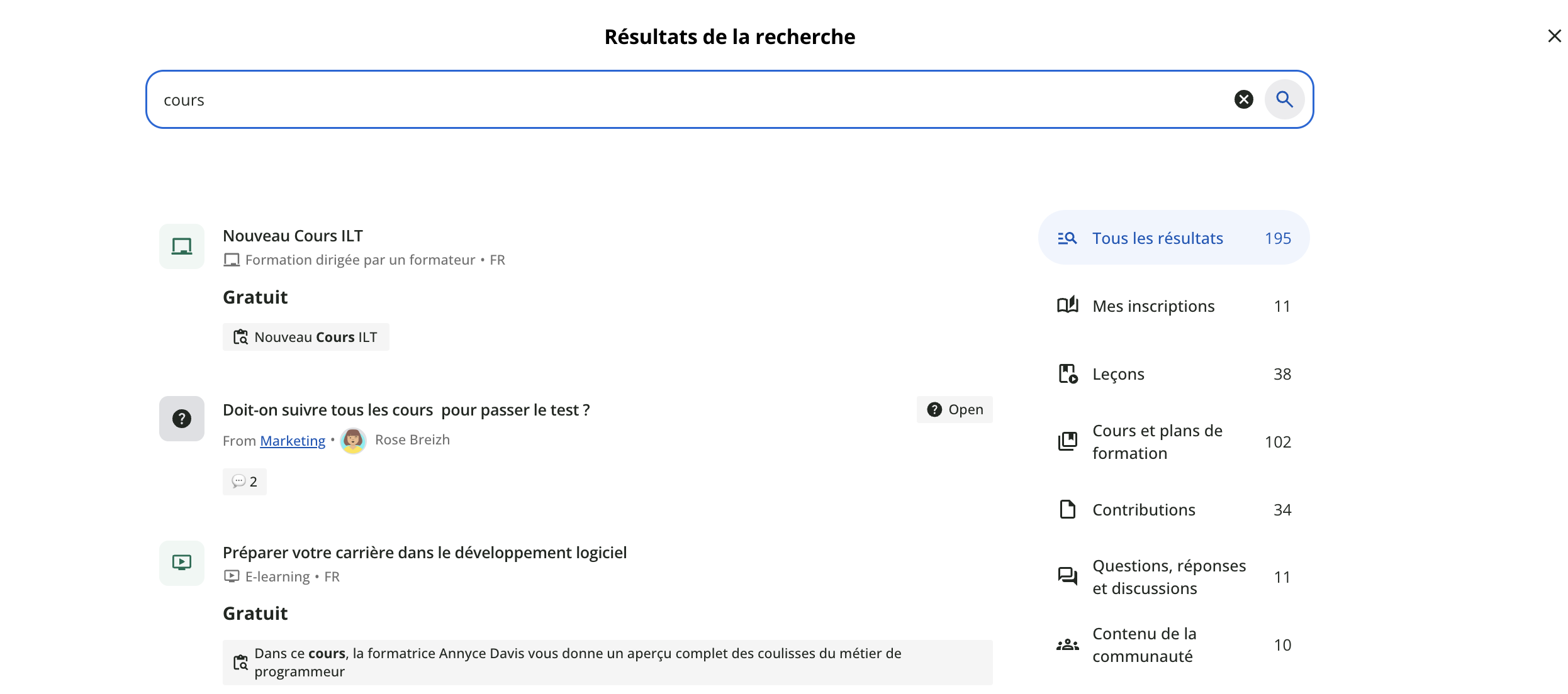 La page des résultats de recherche affiche directement les liens vers le contenu de la plateforme correspondant à votre requête. Vous pouvez utiliser les filtres sur la droite pour limiter les types de contenu (par exemple, uniquement le contenu auquel vous êtes inscrit, uniquement les contributions informelles ou uniquement les questions et réponses et les discussions) pouvant figurer dans les résultats. → Pour en savoir plus, consultez le chapitre Page des résultats de recherche |