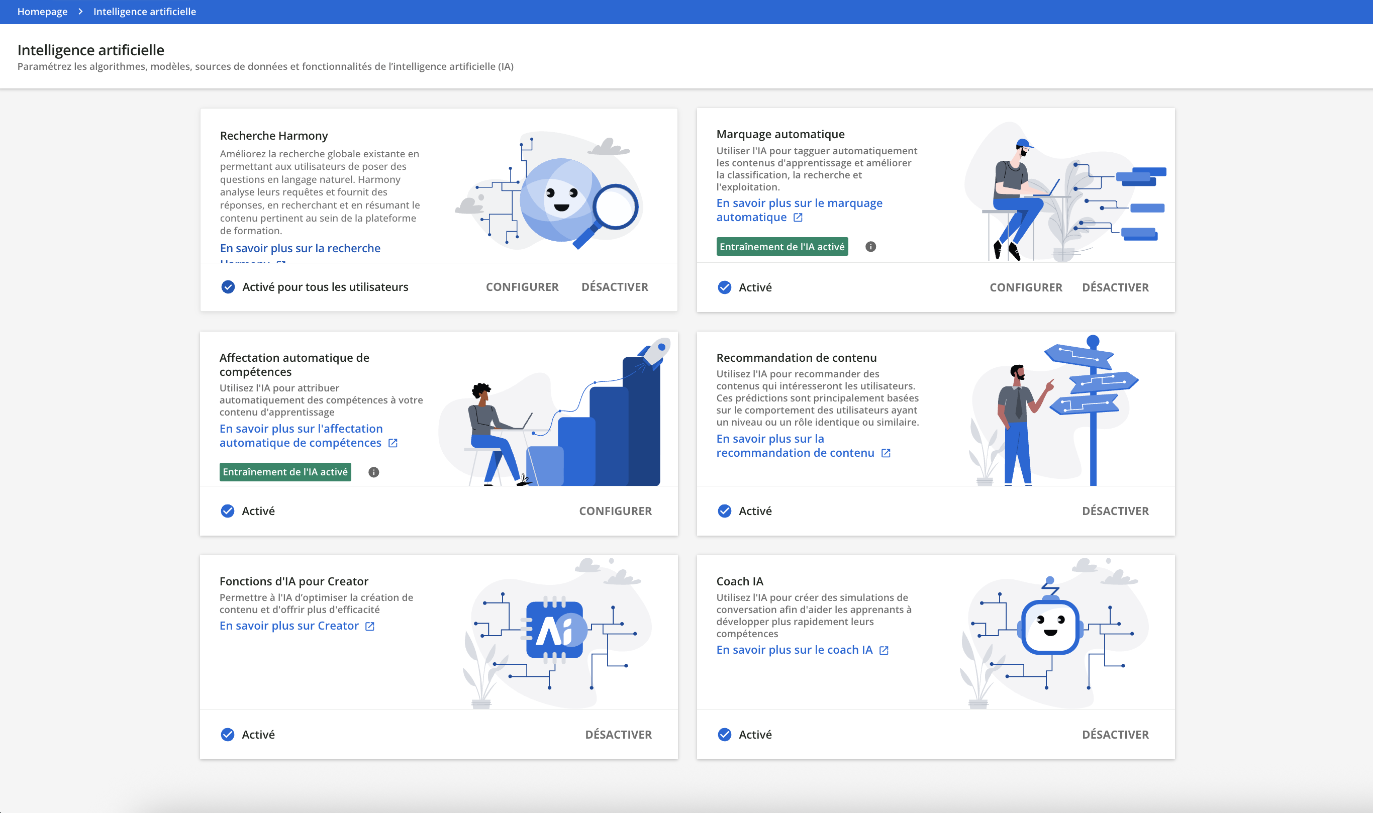 Pour activer Harmony, sélectionnez Menu admin > Intelligence artificielle > Gérer pour ouvrir la page de configuration de l’IA, et localisez la carte Harmony. Celle-ci indiquera si cet outil est actuellement :