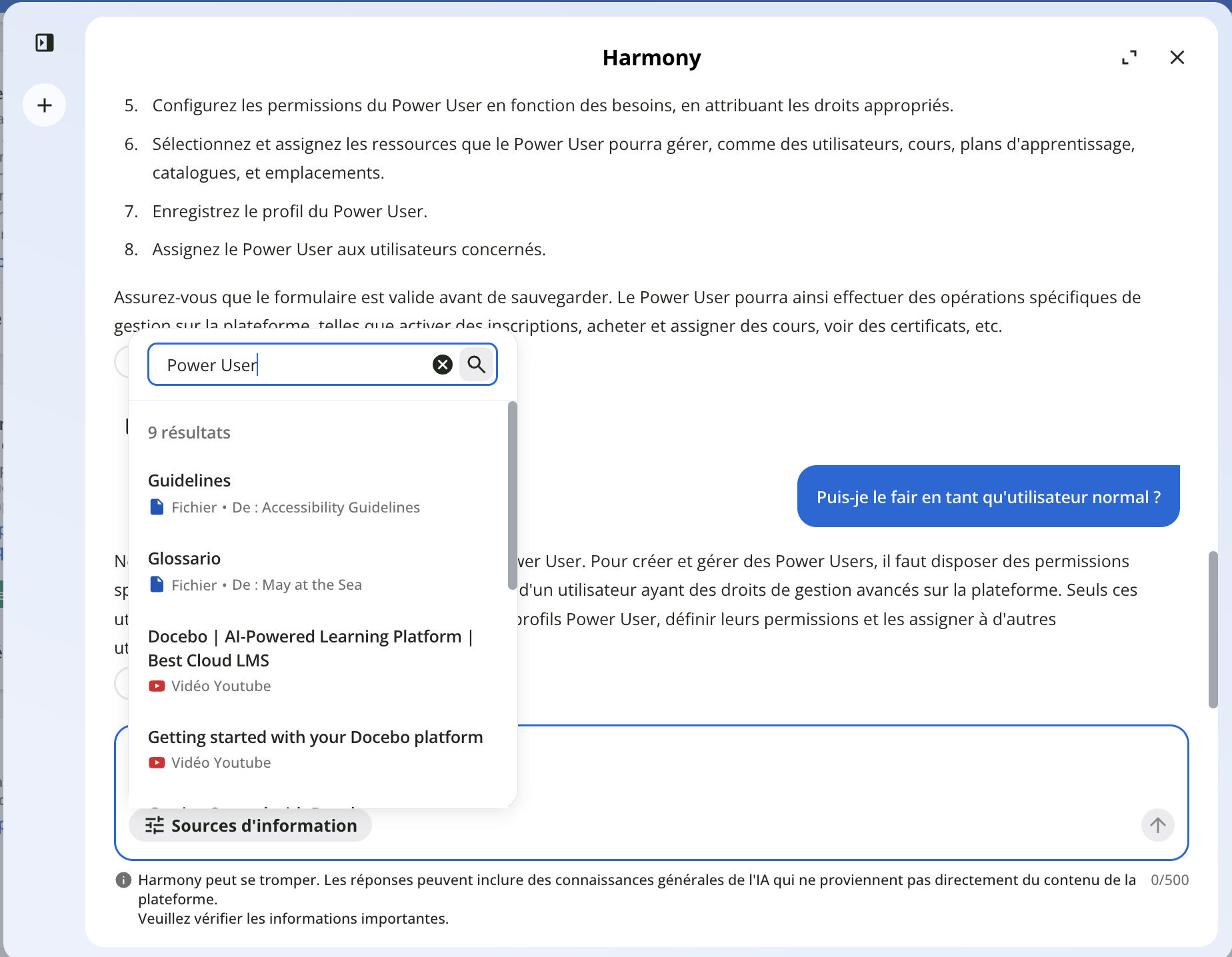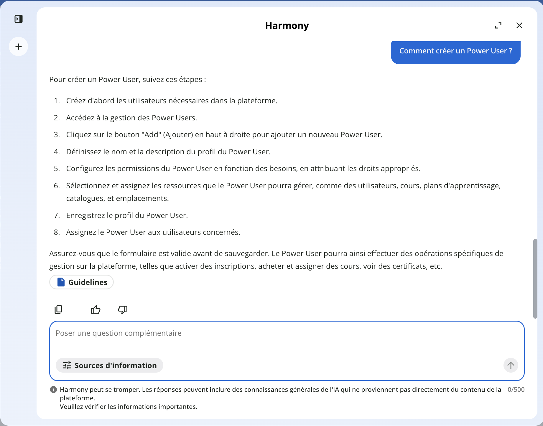 À noter : le chat de Harmony fournit uniquement des réponses en référence au contenu de la plateforme également visible par l’utilisateur. Pour en savoir plus, consultez le chapitre Contenu utilisé pour les réponses de Harmony.
