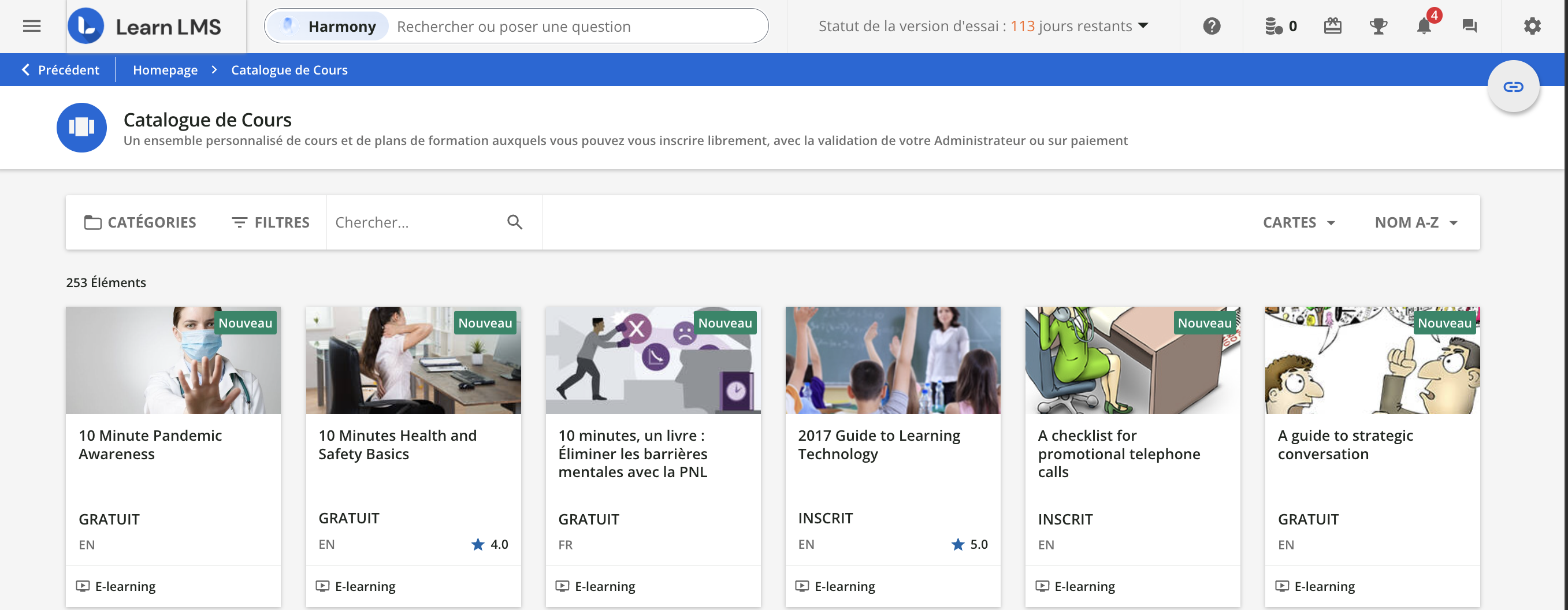 → Par exemple, dans l’espace de contenu Cours et plans de formation, les apprenants ne verront que le contenu qui leur serait de toute façon visible sur la page Catalogue de cours de la plateforme.