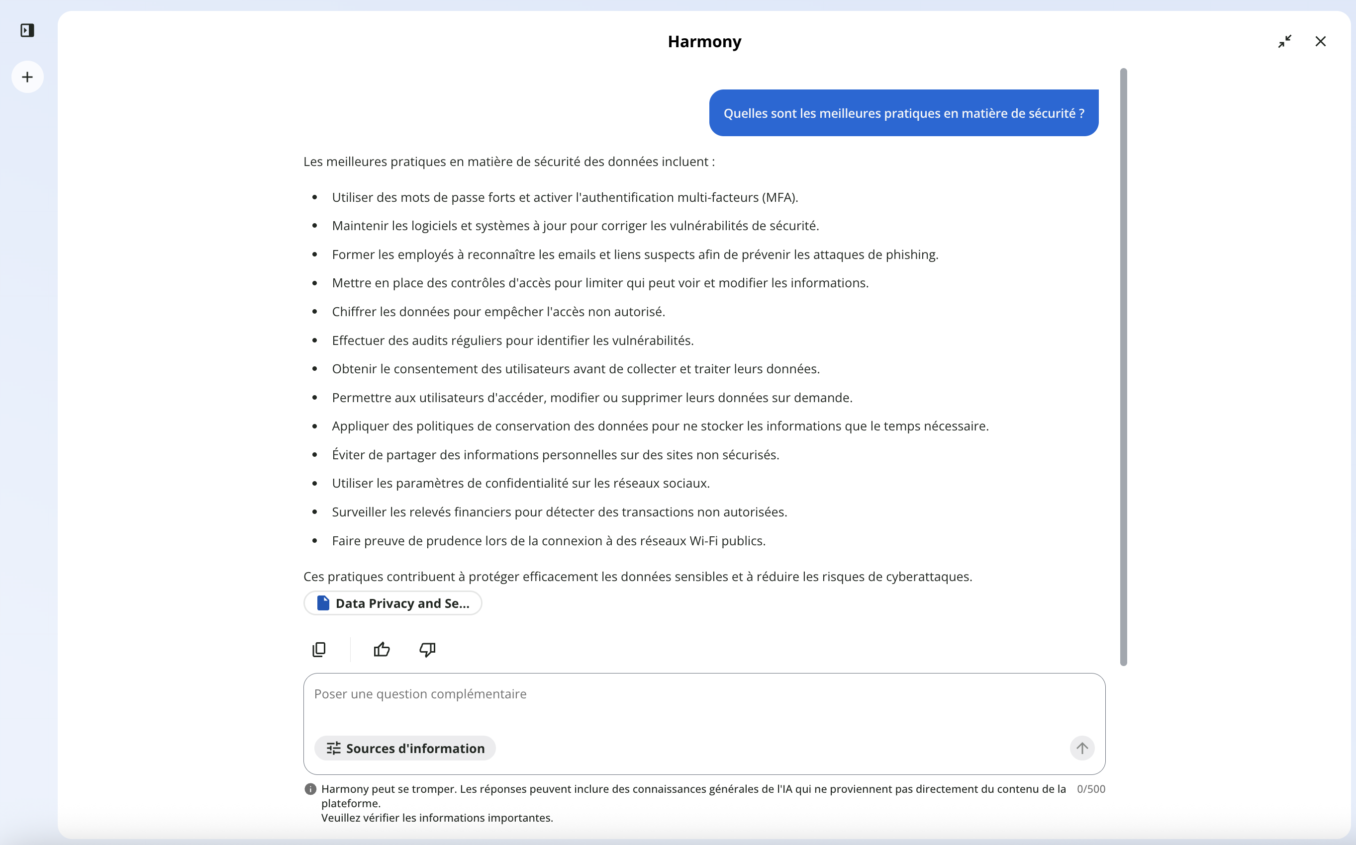 Sous la synthèse de l’IA, vous pouvez poser des questions supplémentaires. Ce faisant, vous accéderez à la fenêtre de chat de Harmonypour poursuivre la conversation.