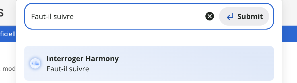 - Lorsque vous commencez à saisir une requête de recherche, cliquez sur Interroger Harmony pour accéder directement à la fenêtre de discussion de Harmony
