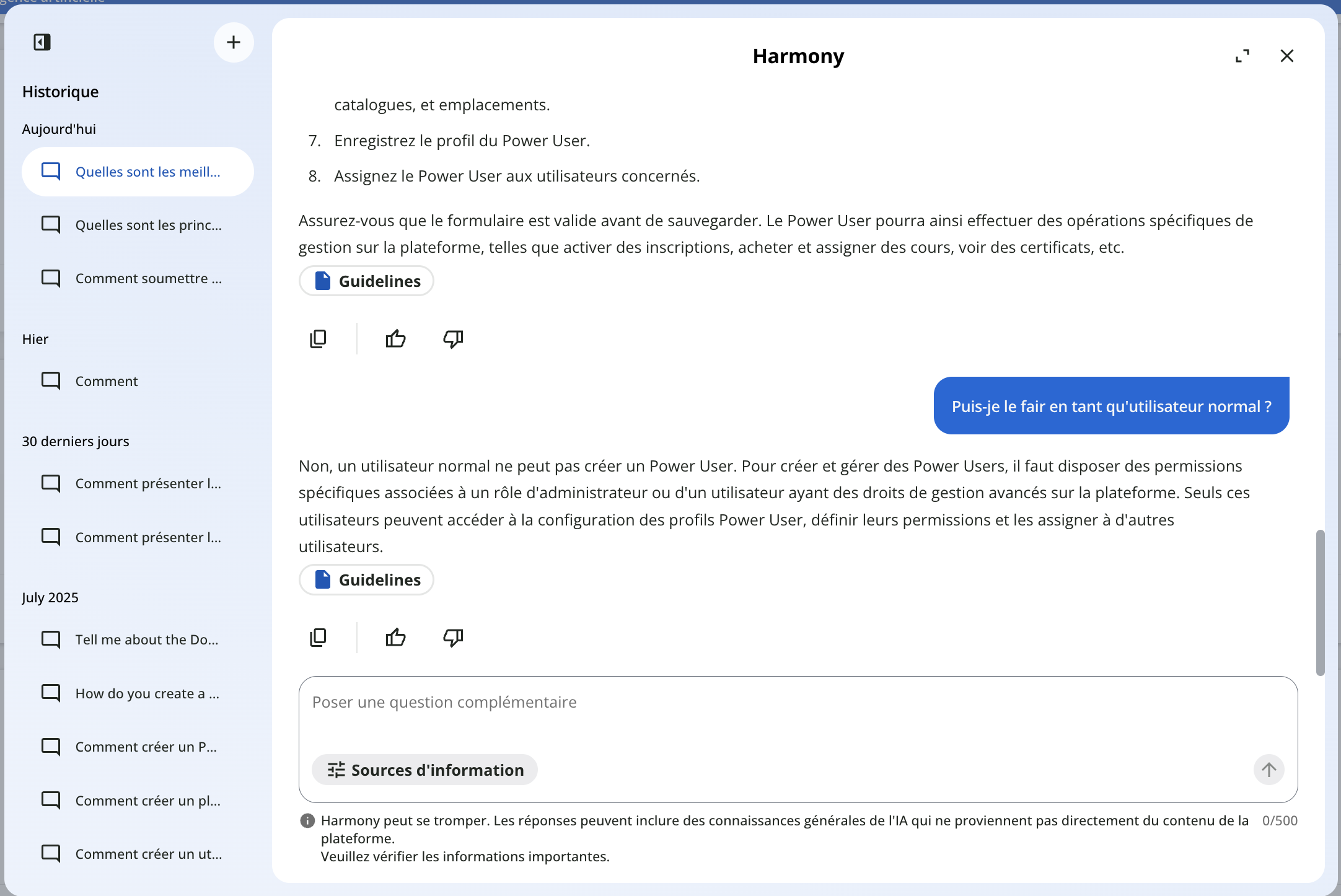| La réponse qui s’affiche dans la fenêtre de chat avec l’IA inclura des liens vers le contenu de la plateforme d’où provient la réponse. Vous pouvez cliquer dessus pour les consulter directement, ou poser une question complémentaire, et utiliser le filtre Sources d’information pour limiter celles pouvant servir de référence à l’IA. → Pour en savoir plus, consultez le chapitre Fenêtre de chat de Harmony |