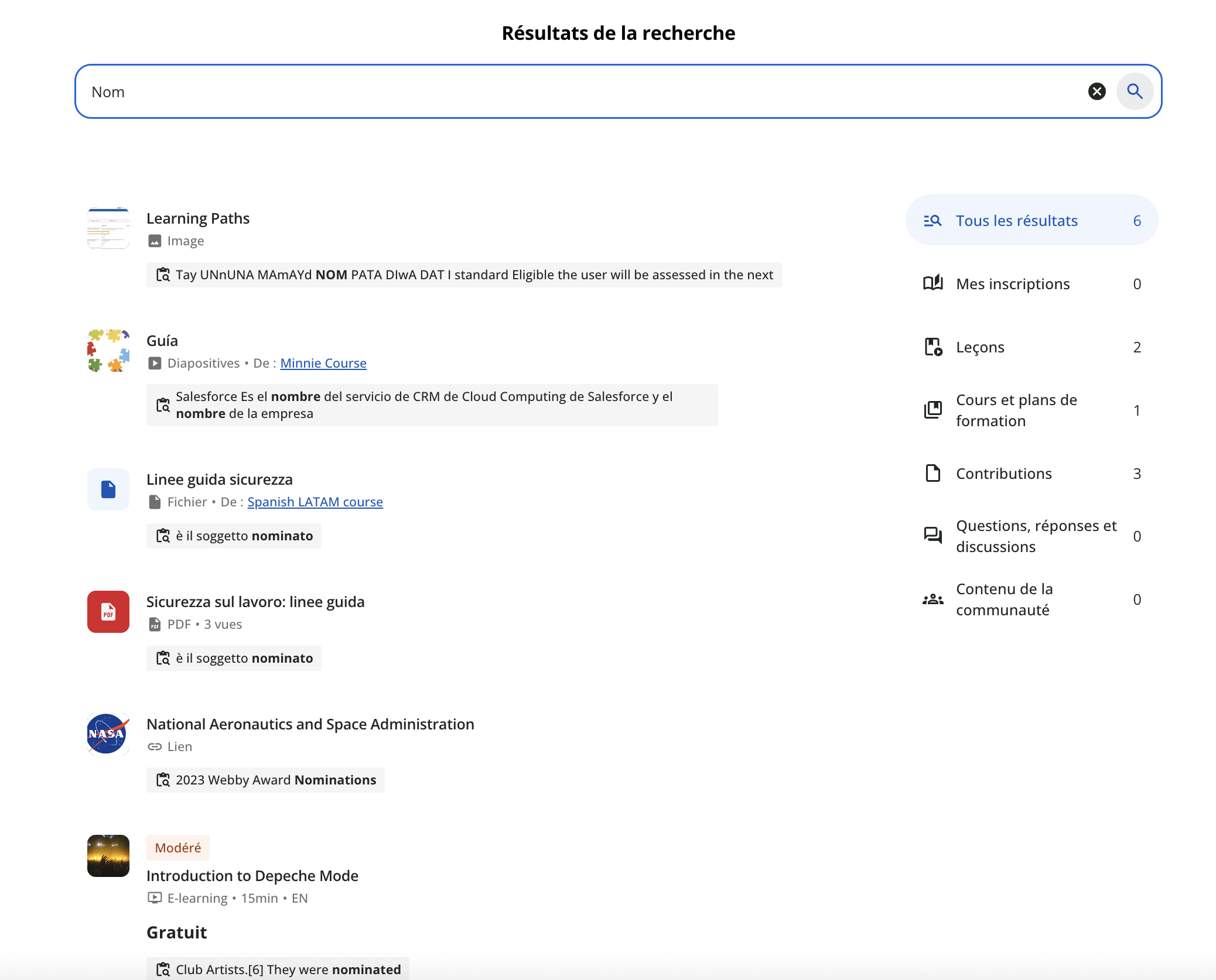 → Les espaces de contenu disponibles dans les résultats dépendent des paramètres avancés de la recherche globale configurés sur la plateforme. Si un espace de contenu particulier a été désactivé dans ces paramètres, son contenu sera entièrement exclu des résultats de la recherche.