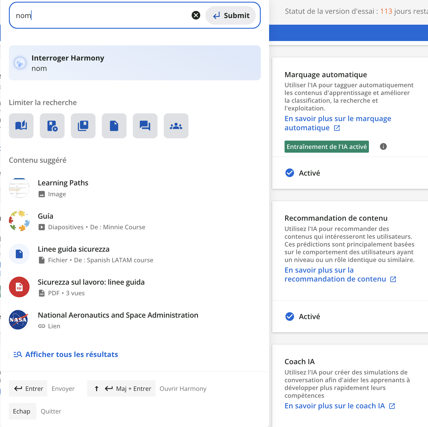 Les résultats renvoyés par la recherche par mots-clés sont limités aux espaces de contenu activés dans les paramètres de la recherche globale. Et cela s’applique sur l’ensemble de la plateforme.