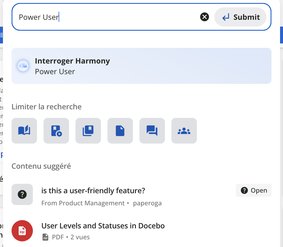 À noter : les commentaires fournis par les boutons « pouce en l'air » et « pouce en bas » sont recueillis de manière anonyme, et utilisés en interne par Docebo pour améliorer l’expérience proposée par la recherche Harmony. Ils ne sont pas partagés avec d’autres administrateurs ou utilisés à des fins d’assistance client.
