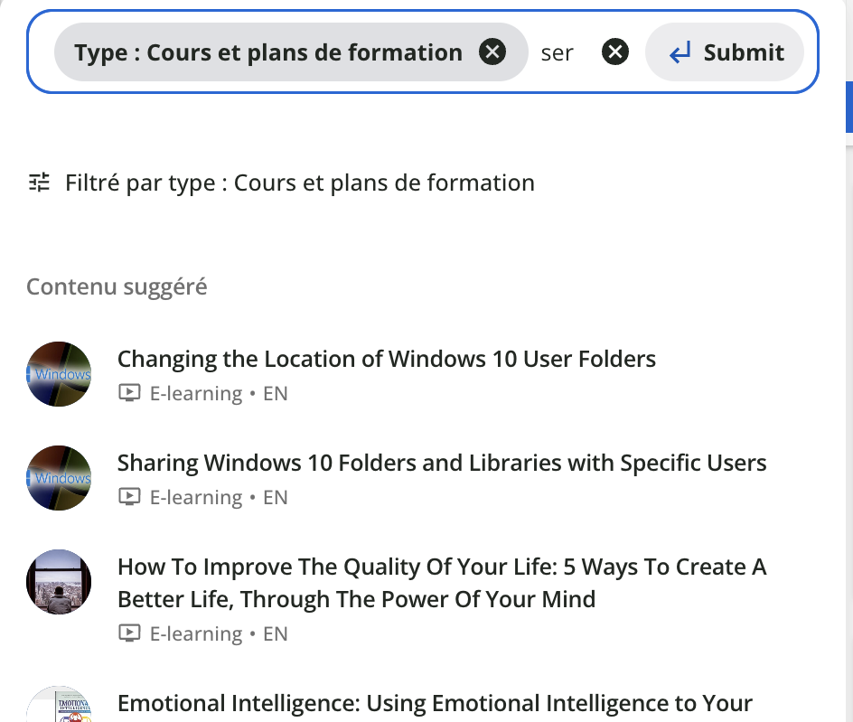 - Par exemple, si vous souhaitez que les utilisateurs ne voient que les résultats de recherche des cours auxquels ils sont inscrits, vous pouvez désactiver Cours et plans de formation et Leçons, et laisser l’espace de contenu Mes inscriptions.