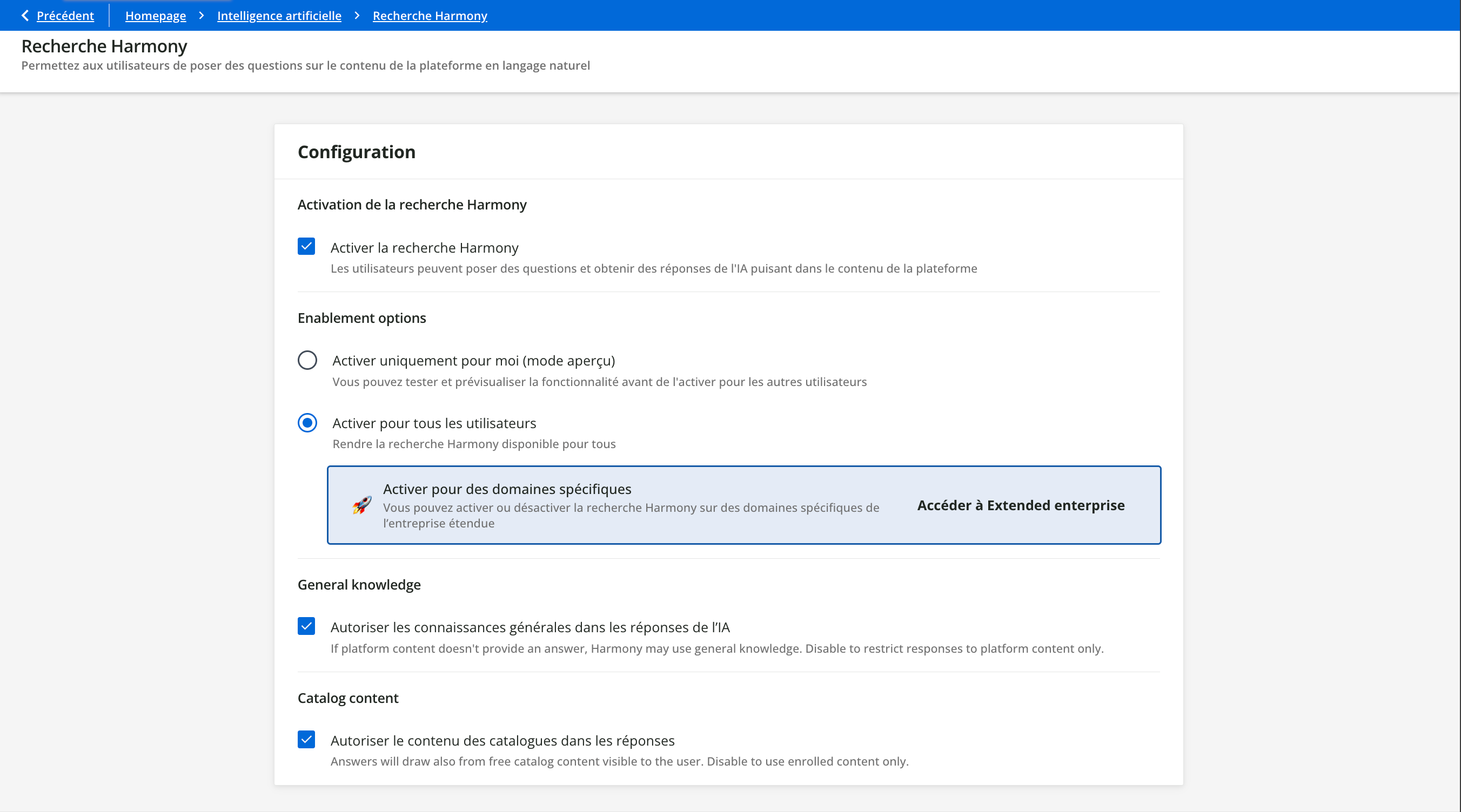 - Désélectionnez cette case pour limiter les réponses de Harmony au seul contenu de la indexé de la plateforme.