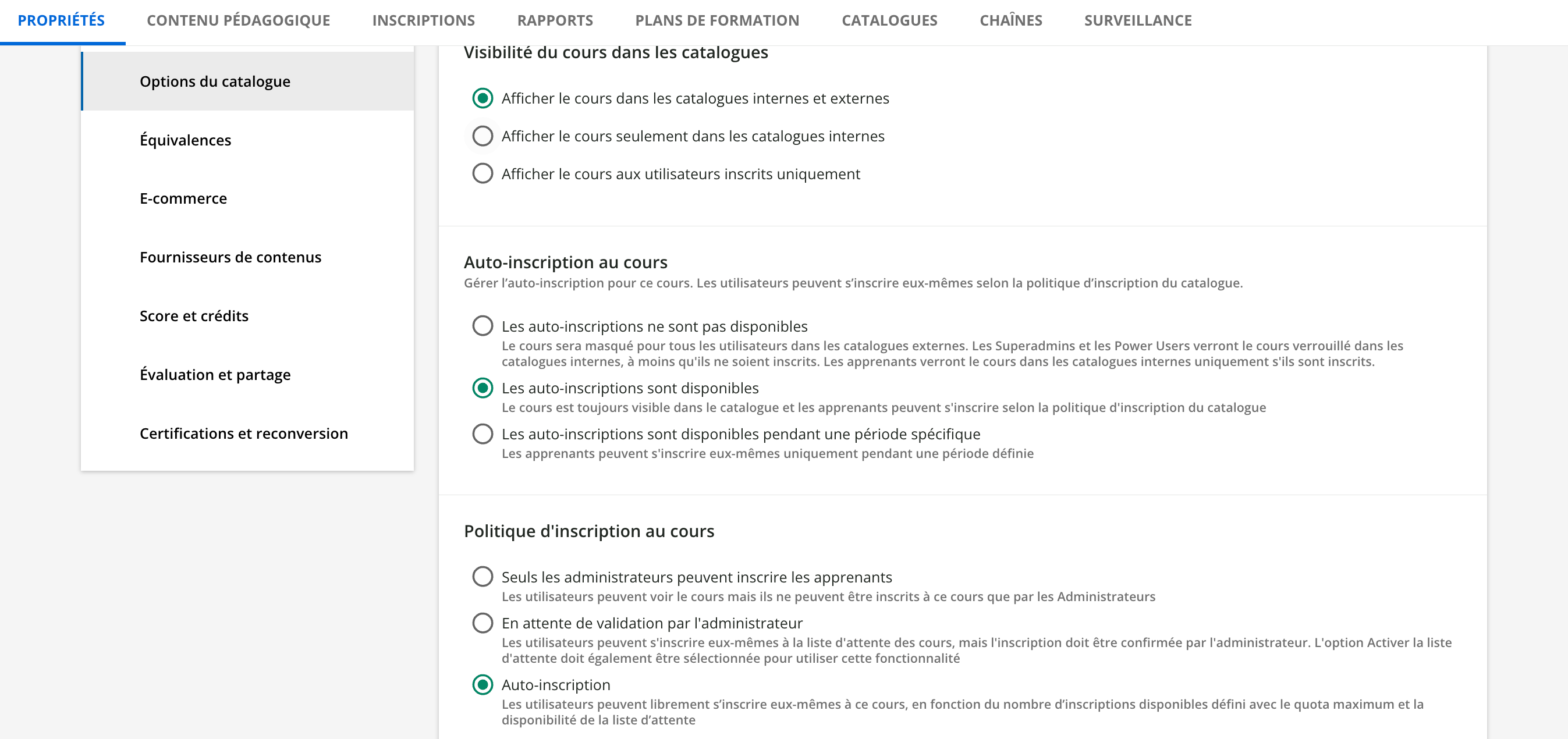 Les options de catalogue du cours sont définies de manière à ce que le cours soit visible et qu’il soit possible de s’y inscrire directement sans l’intervention d’un administrateur :