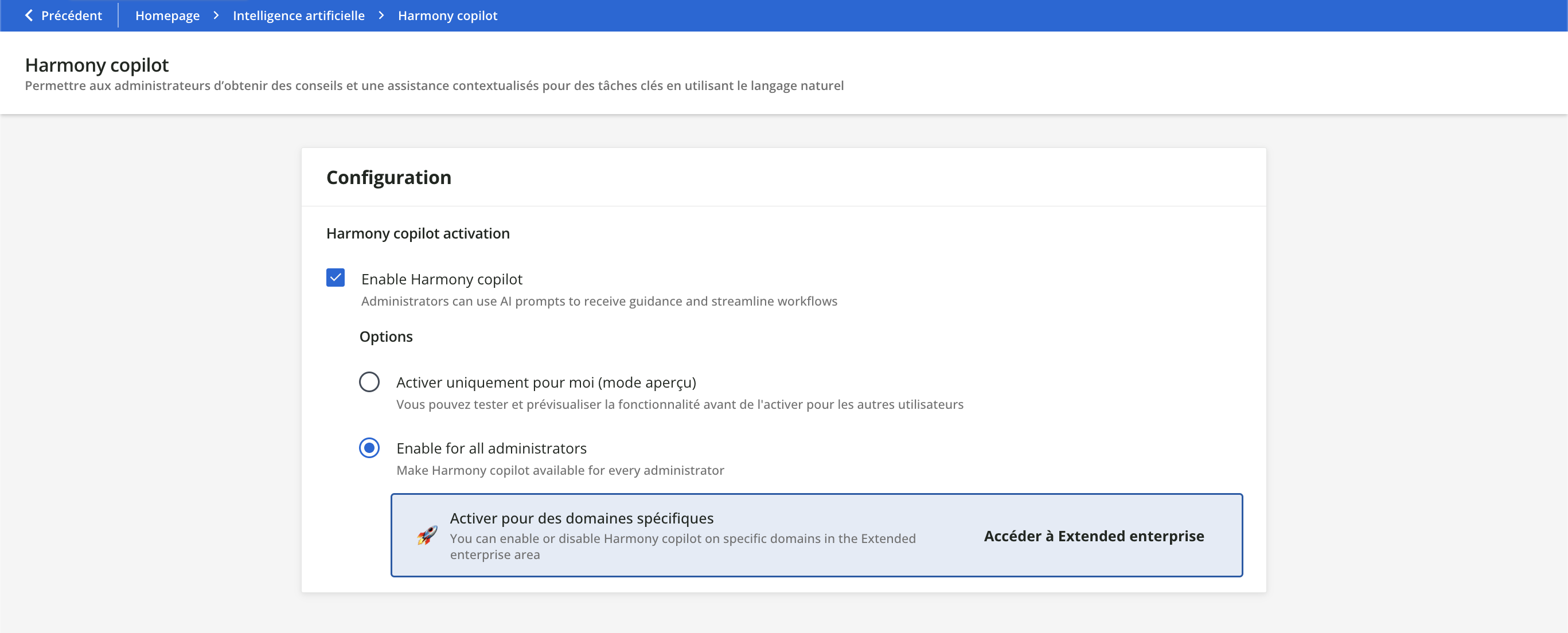Sur les plateformes des entreprises étendues, vous avez la possibilité d'activer ou de désactiver le copilote Harmony de manière sélective, et uniquement sur certains domaines spécifiés.