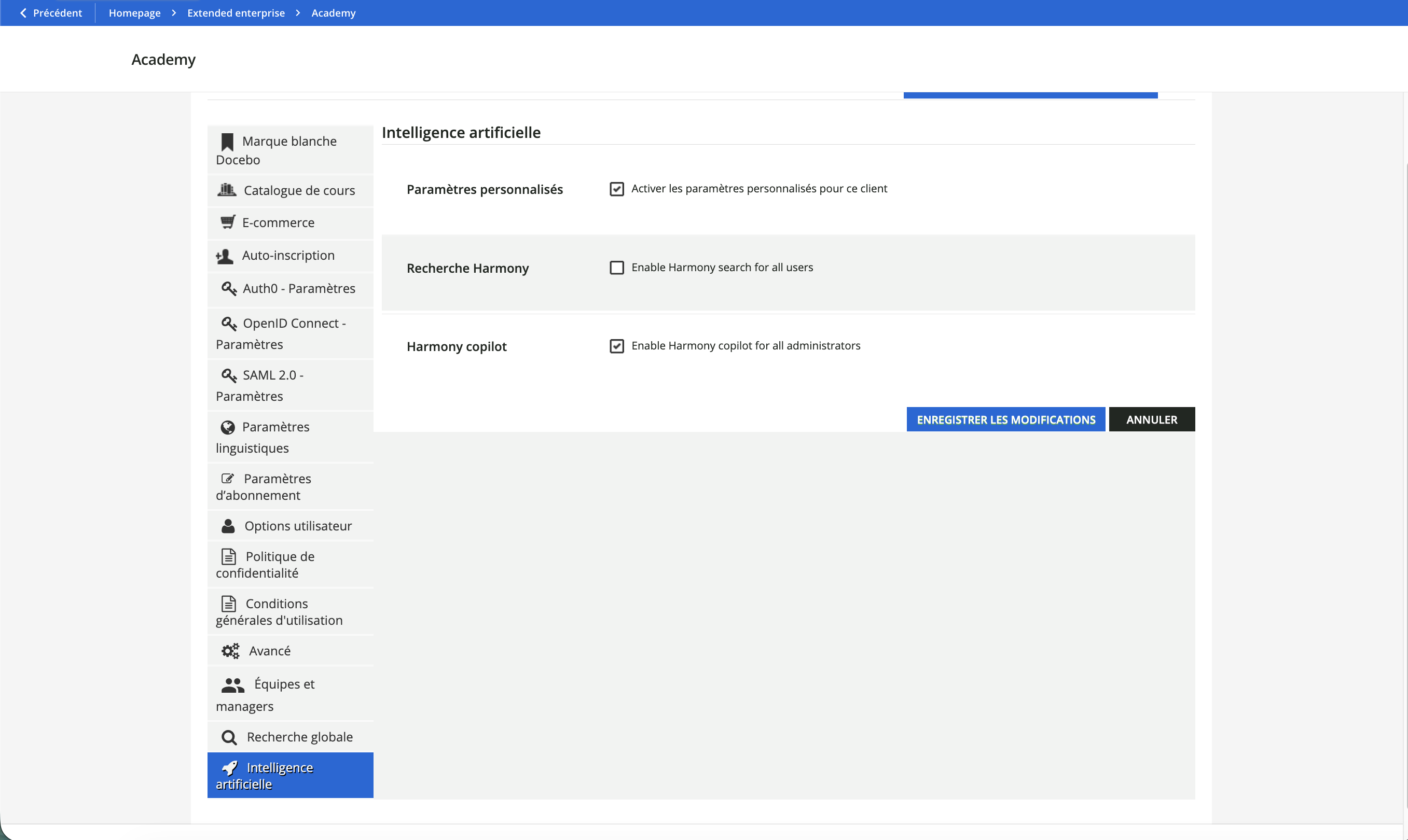 Pour fournir une assistance précise, contextuelle et pertinente, Harmony s'appuie sur ses connaissances générales et sur des sources d’information sélectionnées concernant la plateforme Docebo :