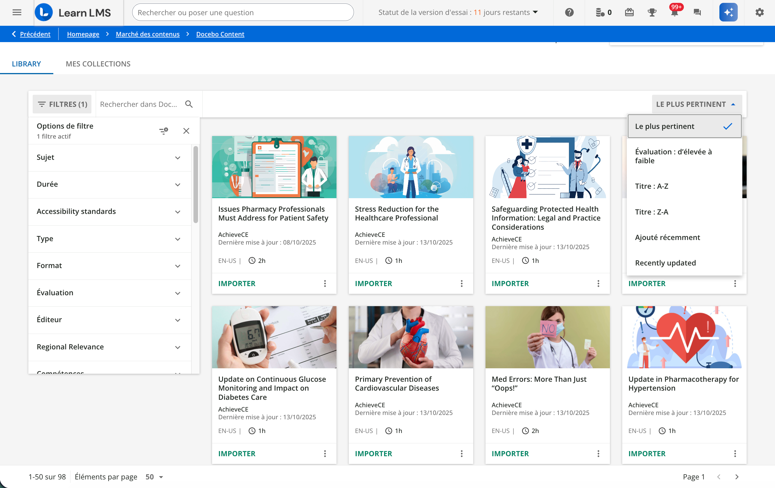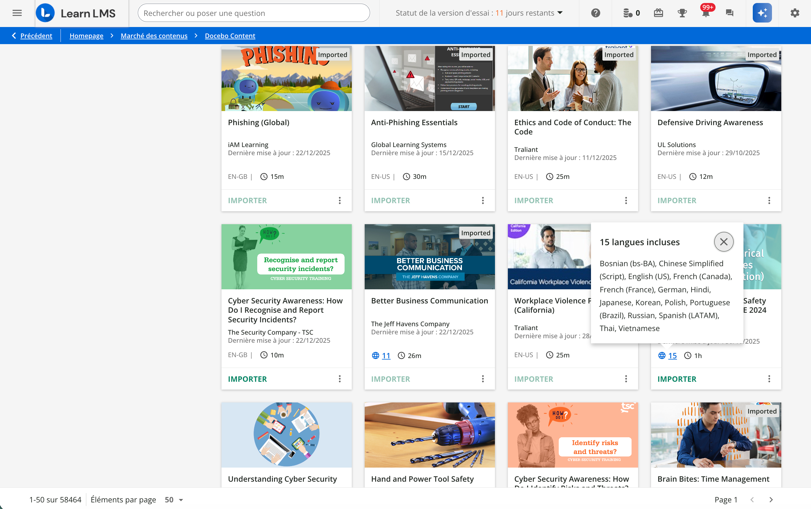 Chaque carte de contenu en indique le titre, l’éditeur, la date de sa dernière mise à jour, sa durée et sa langue ou le nombre de langues disponibles. La mention Nouveau s’affiche si le contenu a été créé au cours des 90 derniers jours, et comme Bientôt retiré le cas échéant. Les cartes de contenu importé portent la mention Imported (Importé). Notez que le format de la date de la dernière mise à jour et de la date de retrait sur les cartes de contenu est au format JJ/MM/AAAA.