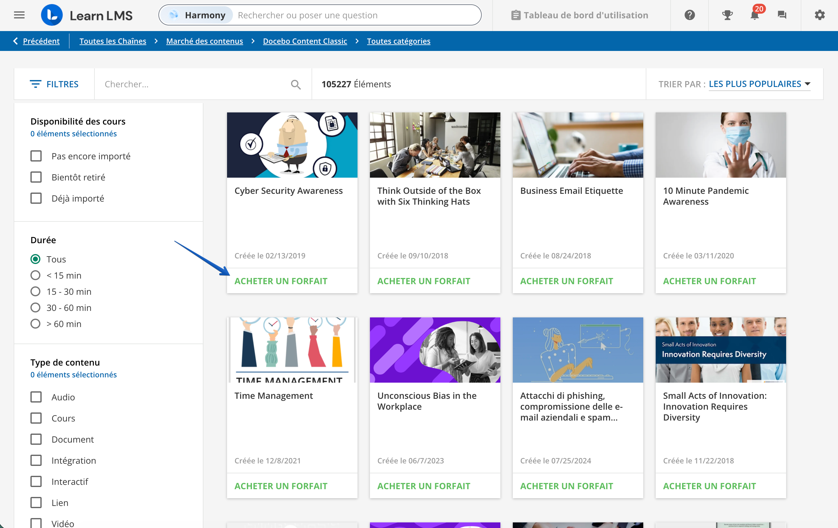 La bibliothèque de Docebo Content offre une large sélection de contenus disponibles à l’achat, tous prêts à être lus sur ordinateur de bureau et appareils mobiles. Tous les contenus sont disponibles en avant-première. Pour pouvoir importer du contenu sur votre plateforme, vous devez acheter un forfait de contenu. Pour ce faire, cliquez sur Acheter un forfait sur la page du Marché des contenus ou sur n’importe quelle carte de contenu.