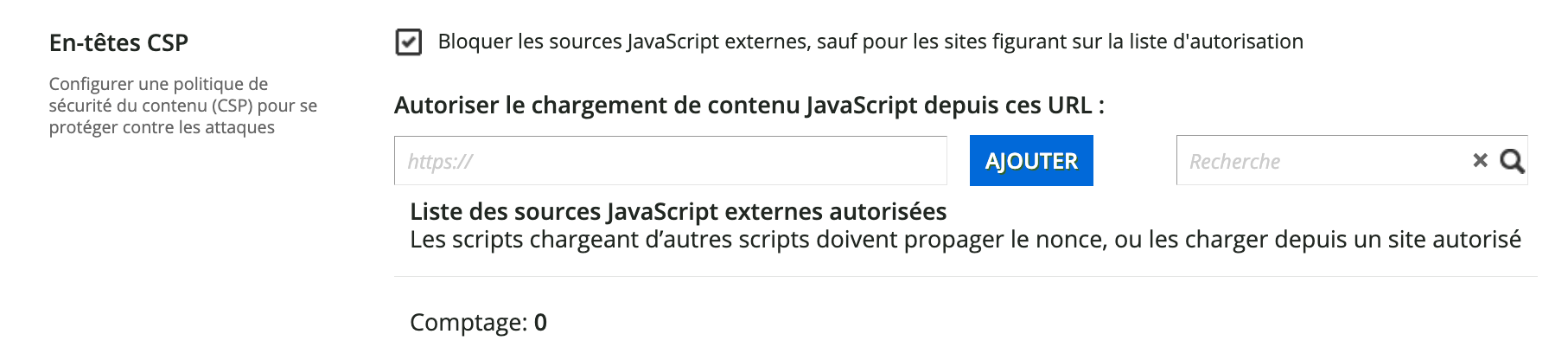 - Sous Liste des sources JavaScript externes autorisées, saisissez les URL des domaines de confiance autorisés à charger du JavaScript.