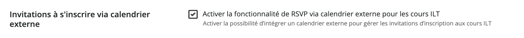 - Une fois activé ici, les invitations sur les calendriers seront automatiquement activées pour tous les nouveaux cours ILT créés. En revanche, les cours ILT existants ne seront pas affectés.