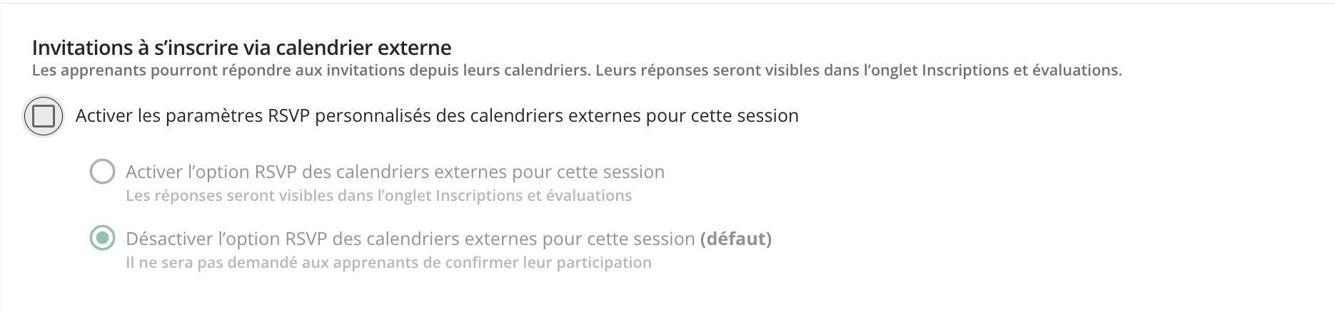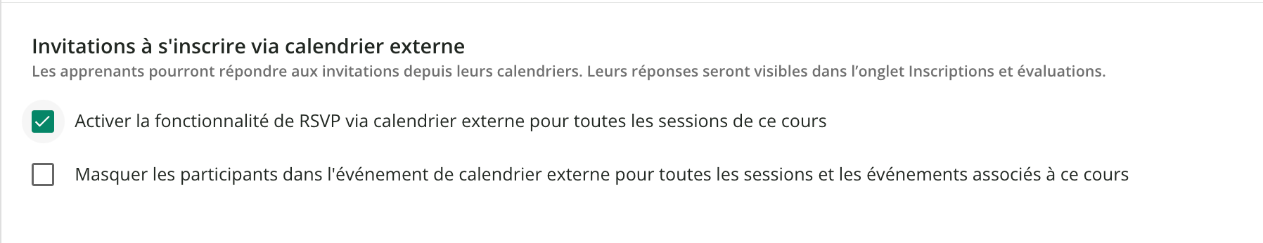 À noter : si l’option Invitations à s’inscrire via calendrier externe est désactivée à n’importe quel niveau (plateforme, cours ou session) après l’envoi des invitations lorsque l’option était active, alors les événements correspondants seront annulés dans les calendriers des apprenants.