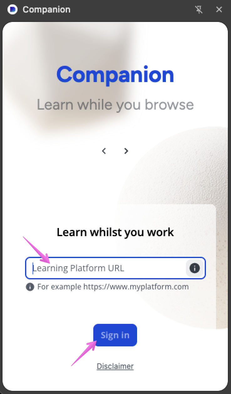 Une fois l’extension de navigateur installée, configurez-la en cliquant sur son icône dans votre barre d’outils des extensions. Ensuite, dans le panneau latéral qui s’affiche, appuyez sur l’épingle pour garder l’extension toujours visible. Puis, dans la fenêtre principale, ajoutez l’URL de votre plateforme de formation et sélectionnez Sign in (Connexion).