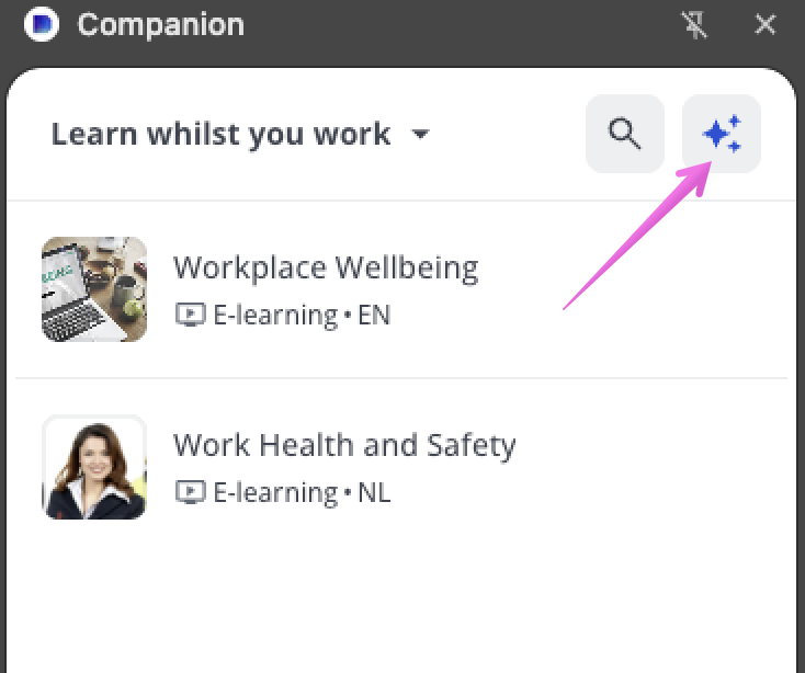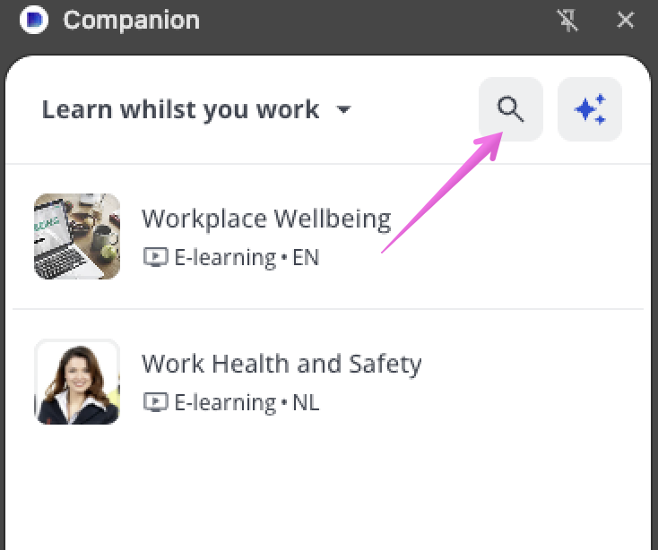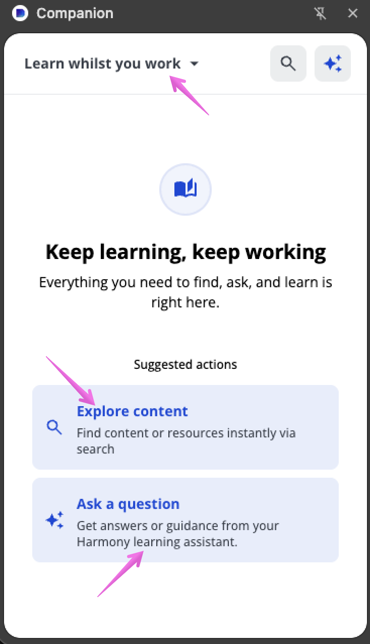 À noter : par défaut, le texte du menu déroulant est Apprenez en travaillant mais ce texte peut être modifié par votre administrateur dans la section Titre de connexion des options de personnalisation de Companion.