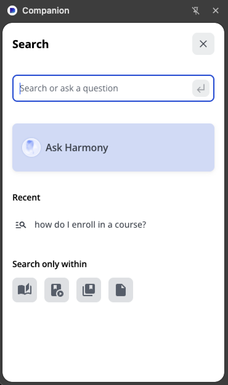 Docebo Companion ne se limite pas à afficher la sélection de contenu associé à la page web que vous consultez actuellement. En cliquant dans la barre Rechercher ou poser une question, vous pouvez également rechercher l’ensemble du contenu qui vous a été mis à disposition via la plateforme Docebo elle-même, ou demander à Harmony de vous fournir des réponses basées sur le contenu de votre plateforme. Pour en savoir plus sur Harmony, consultez l’article Harmony.